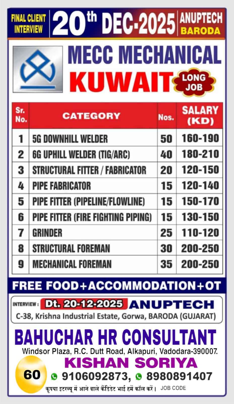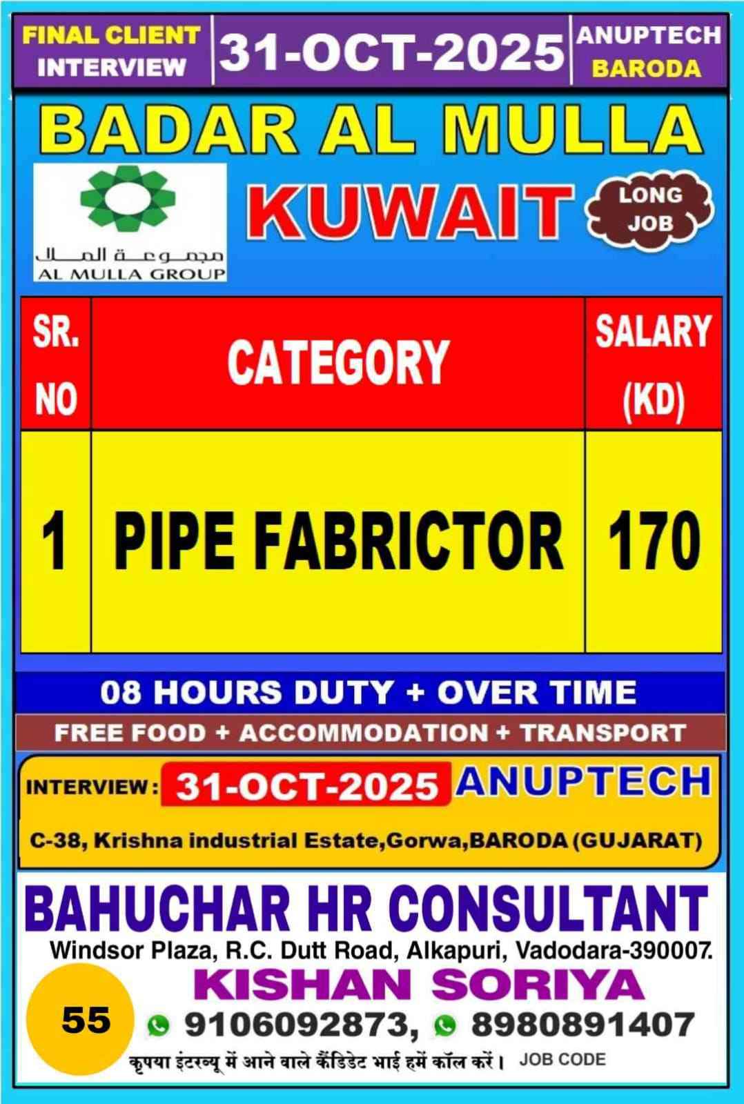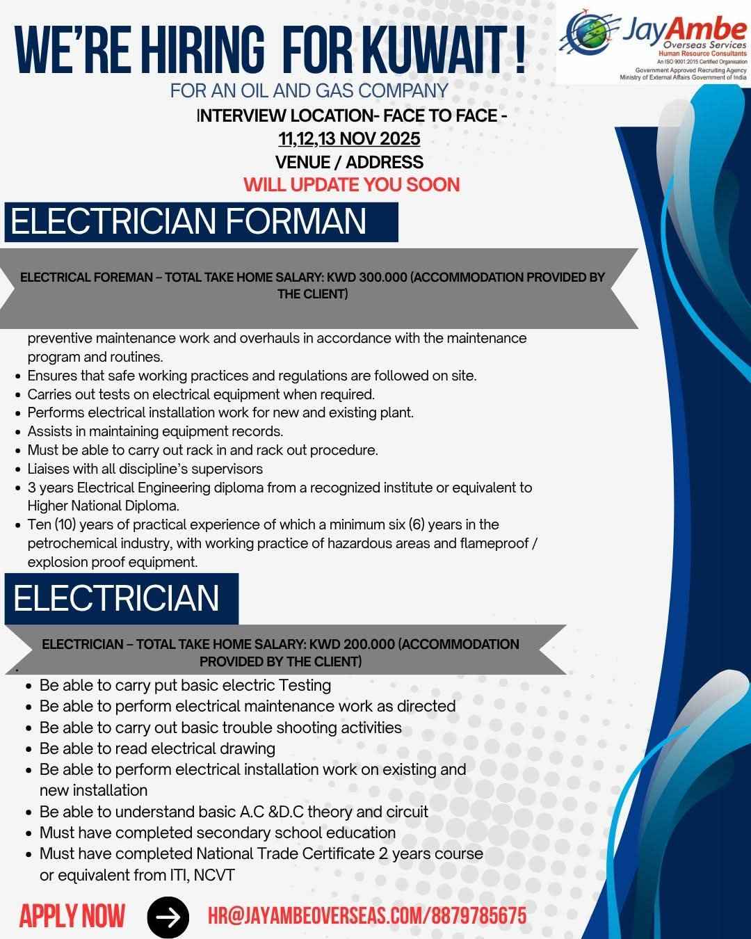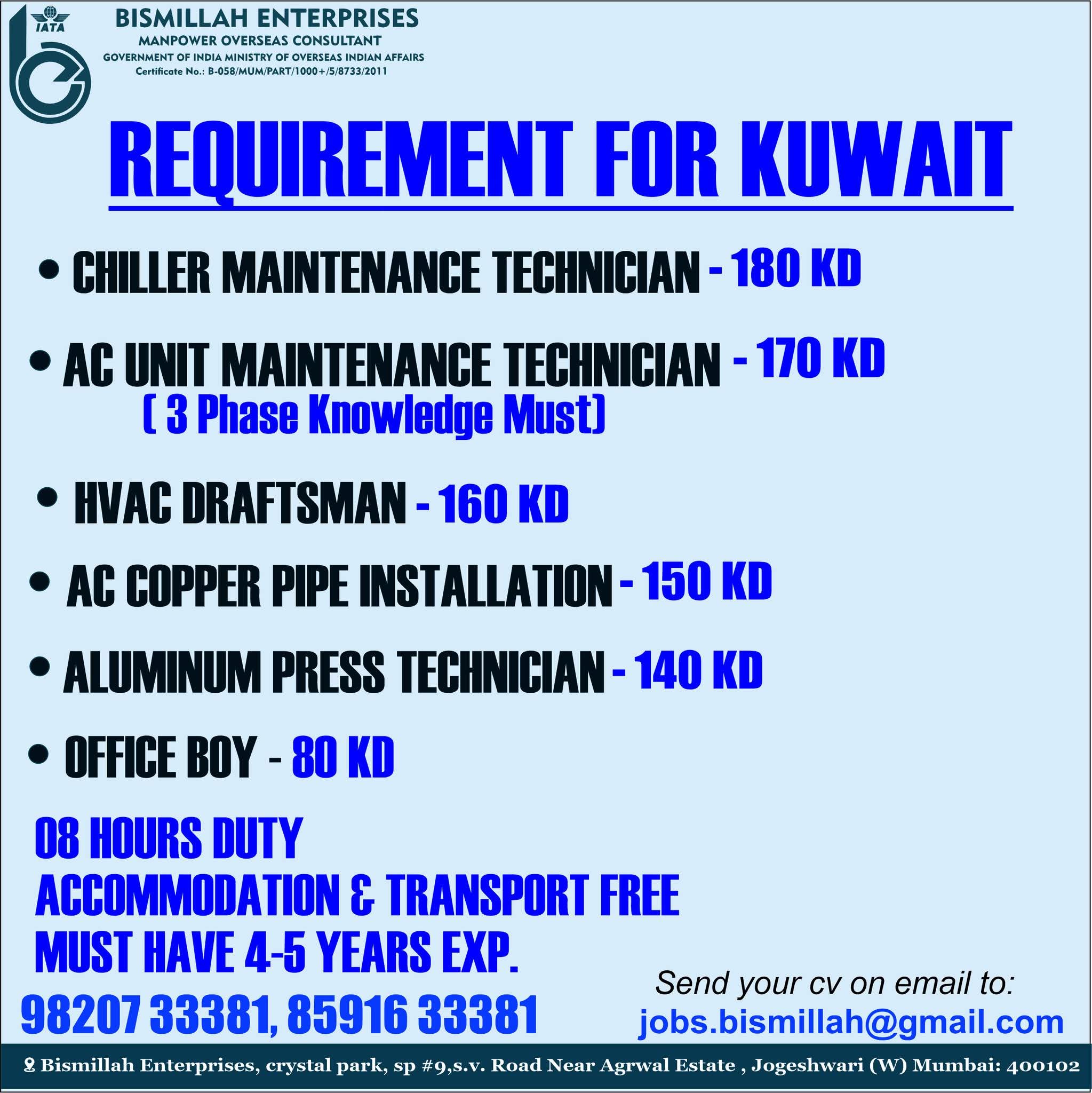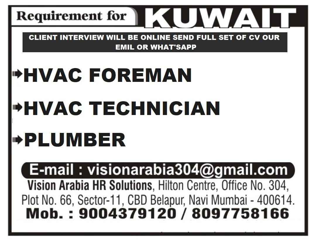 URGENTLY REQUIRED FOR A LEADING KAZEMA COMPANY FOR THIER HVAC INSTALLATION AND MAINTENANCE PROJECTS IN KUWAIT