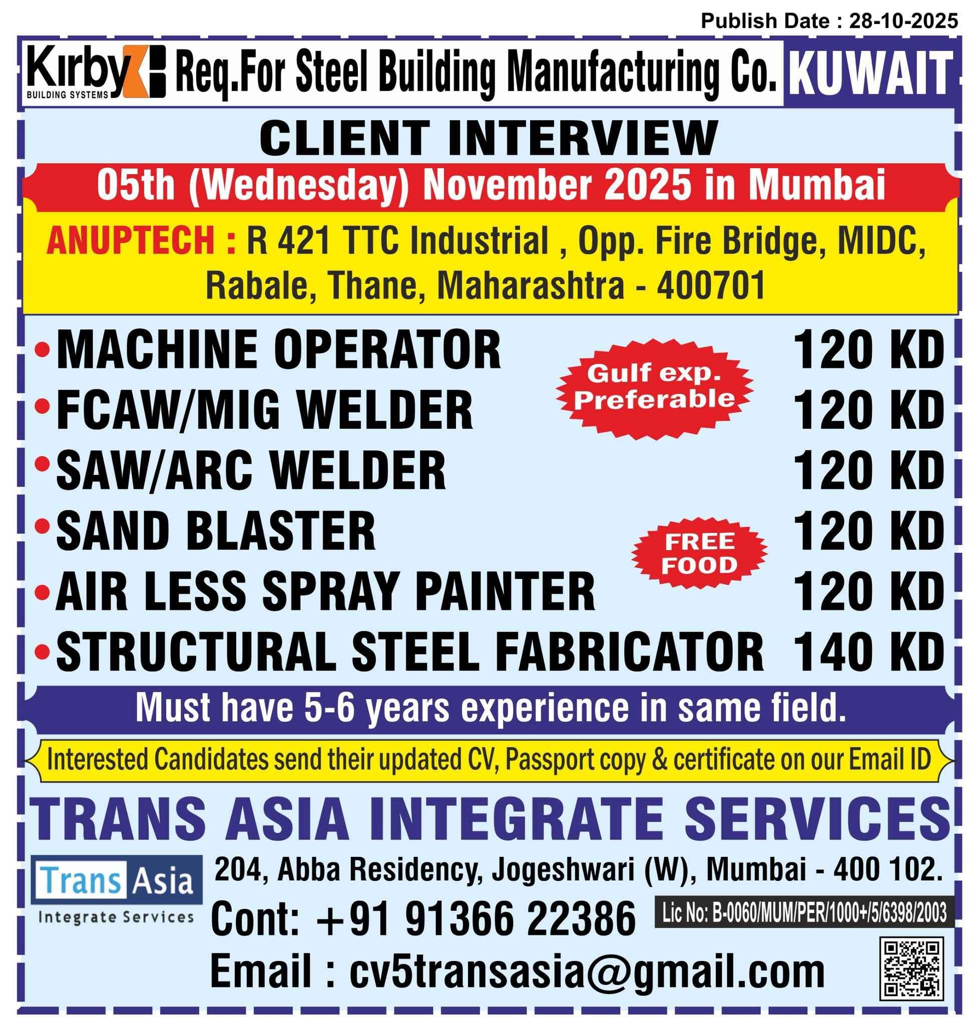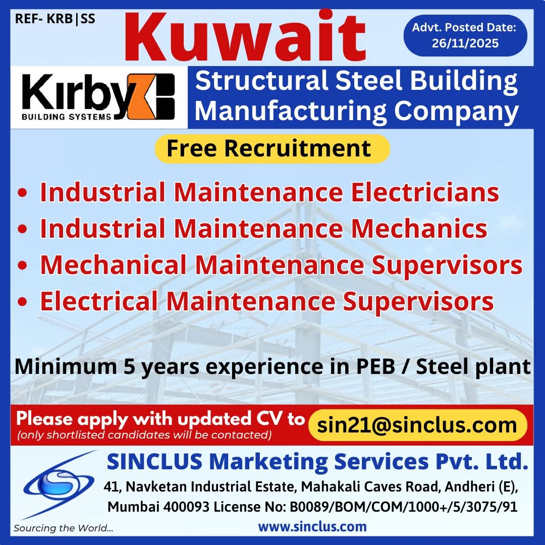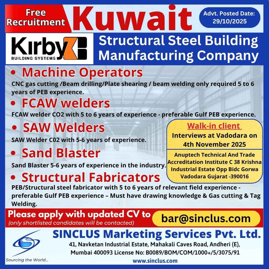 URGENT REQUIREMENT For M/s Kirby Building Systems - Manufacturing Division (Kuwait)