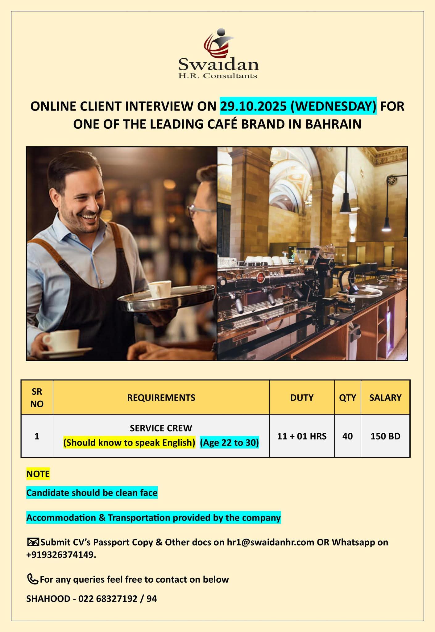 URGENTLY REQUIRED BAHRAIN | DIRECT EMPLOYMENT VISA | IMMEDIATE JOINING FOR A LEADING FINE-DINE RESTAURANT IN BAHRAIN