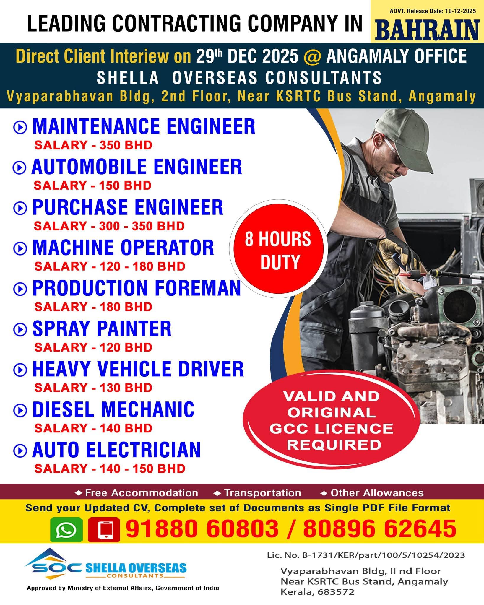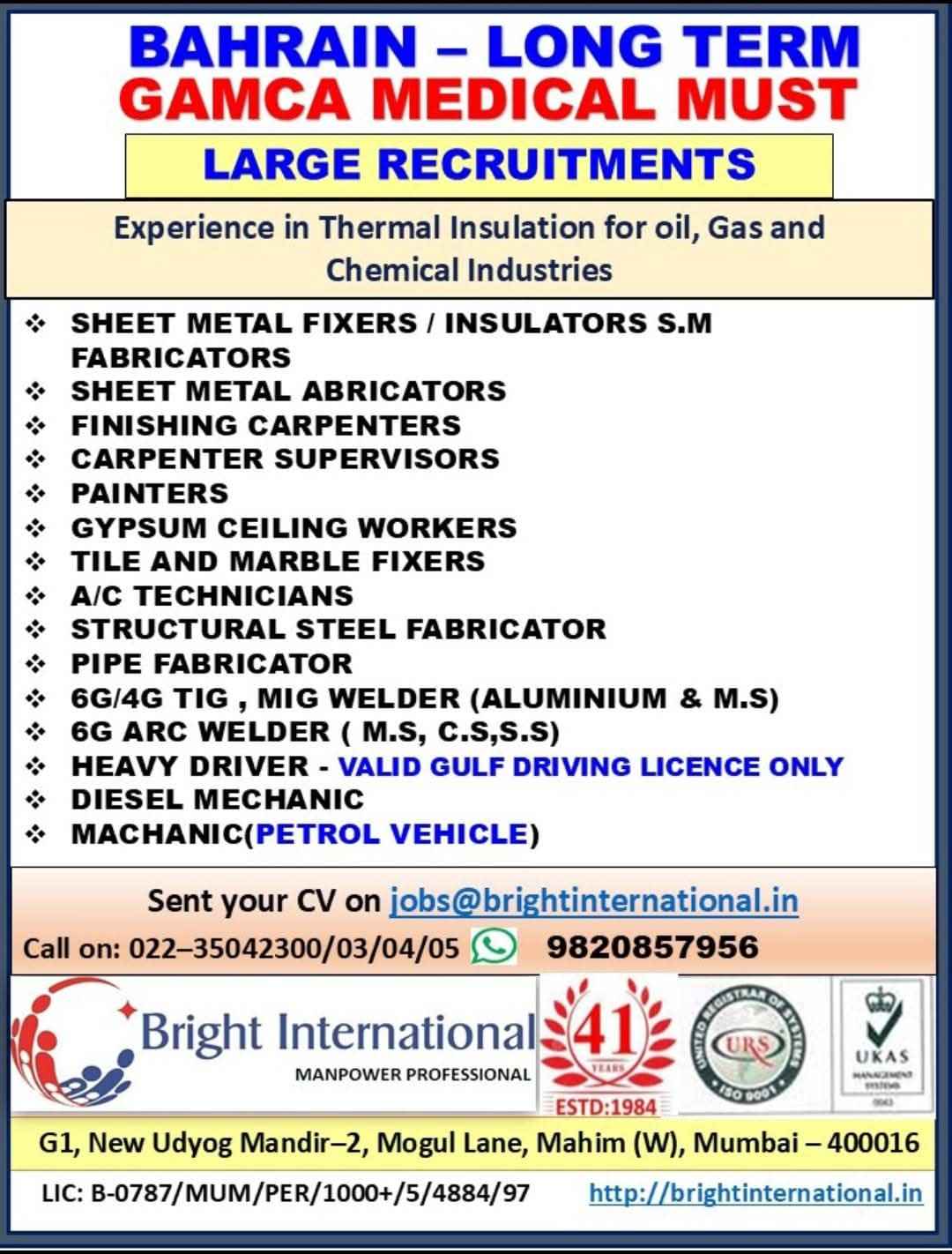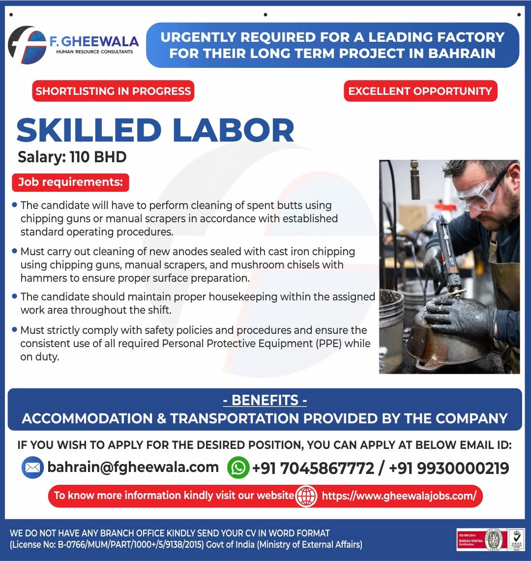 URGENTLY REQUIRED FOR A LEADING FACTORY FOR THEIR LONG TERM PROJECT IN BAHRAIN