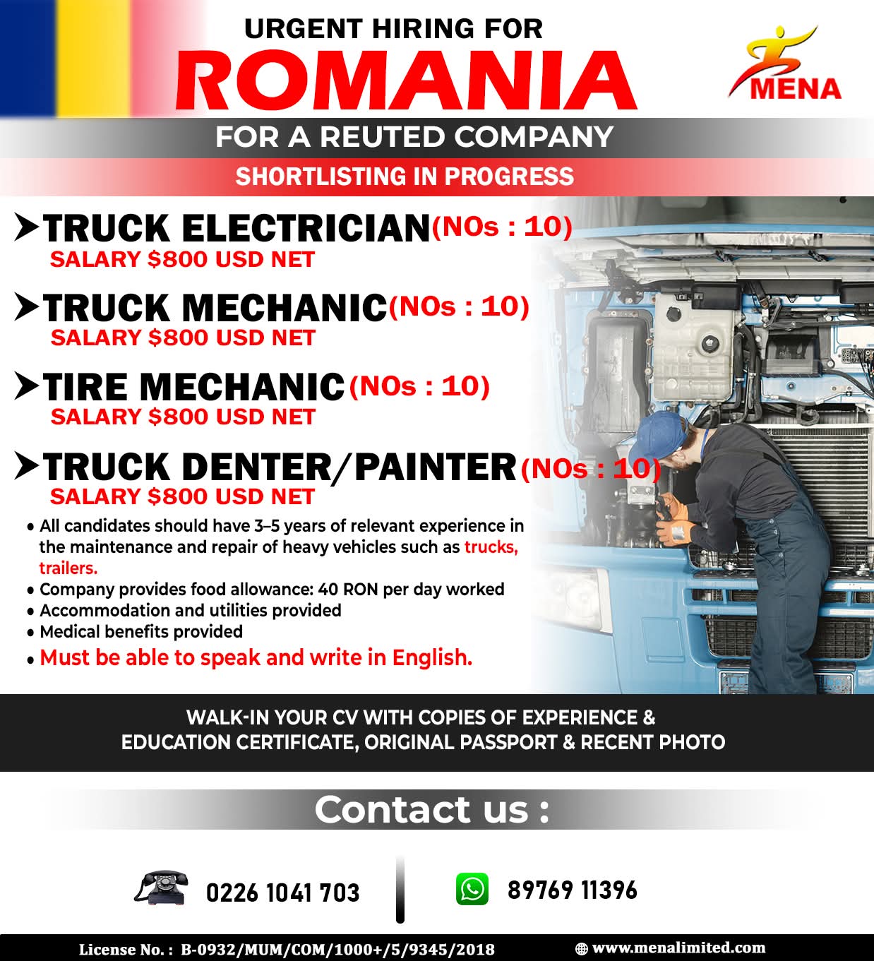 REQUIRED URGENTLY FOR A LEADING CHAIN OF AUTOMOTIVE SERVICE & REPAIRS CENTRES IN ROMANIA