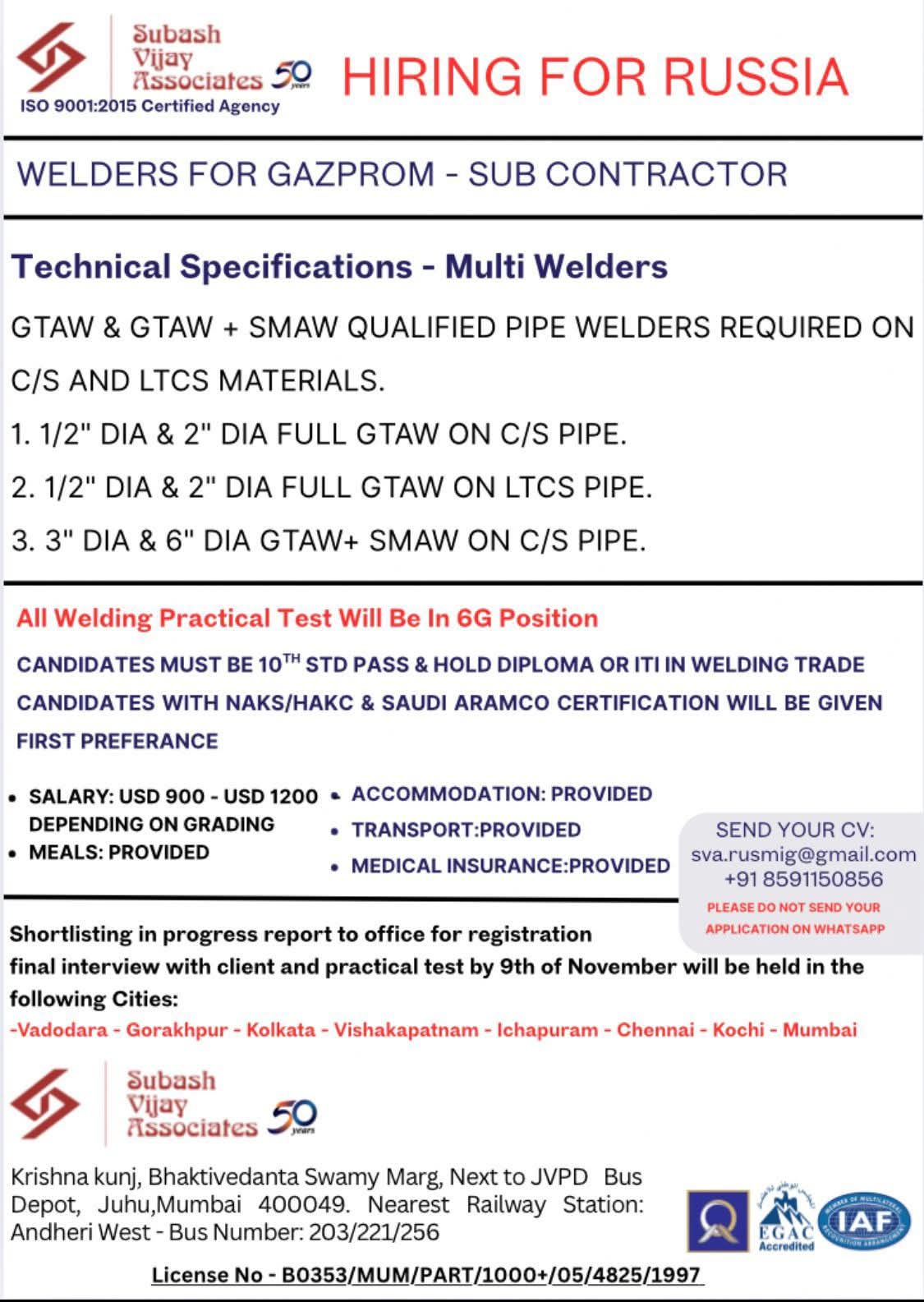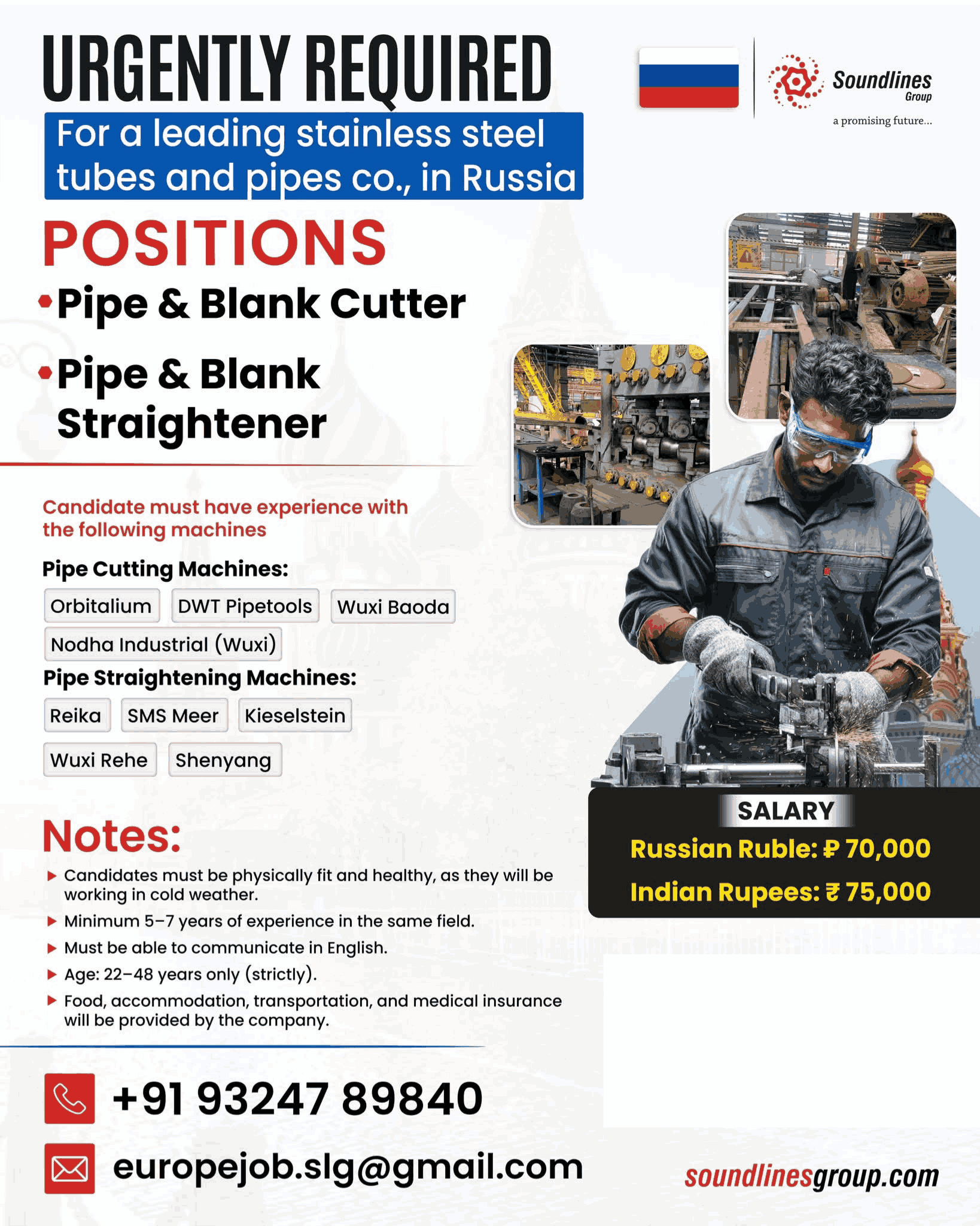 URGENTLY REQUIRED For a leading stainless steel tubes and pipes co., in Russia