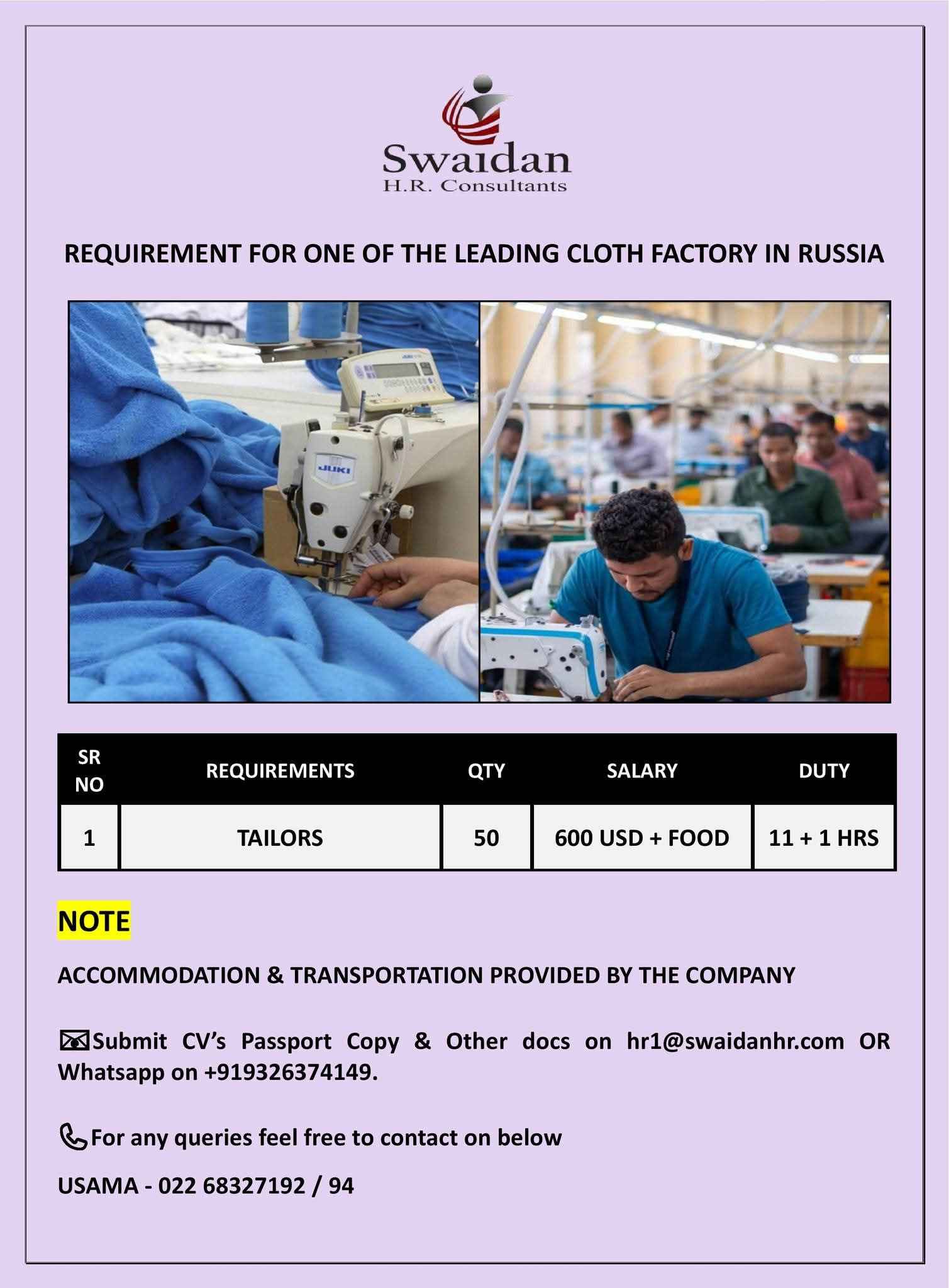 REQUIREMENT FOR ONE OF THE LEADING CLOTH FACTORY IN RUSSIA