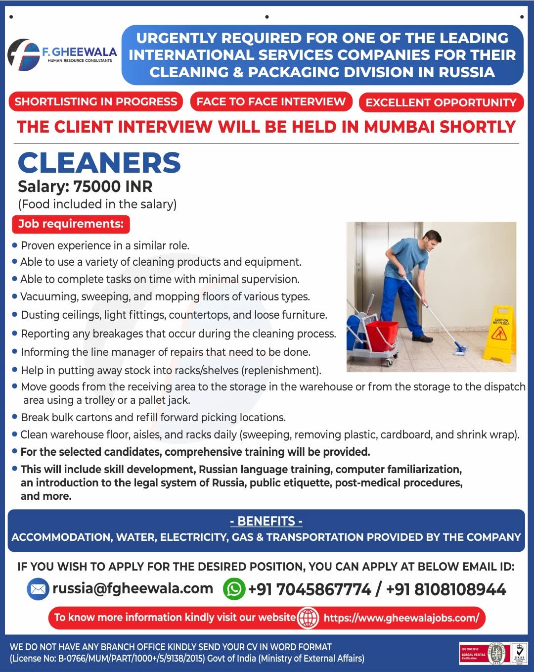 URGENTLY REQUIRED FOR ONE OF THE LEADING INTERNATIONAL SERVICES COMPANIES FOR THEIR CLEANING & PACKAGING DIVISION IN RUSSIA