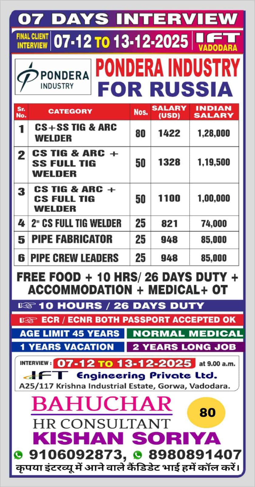 Urgent Requirement For PONDERA INDUSTRY FOR RUSSIA