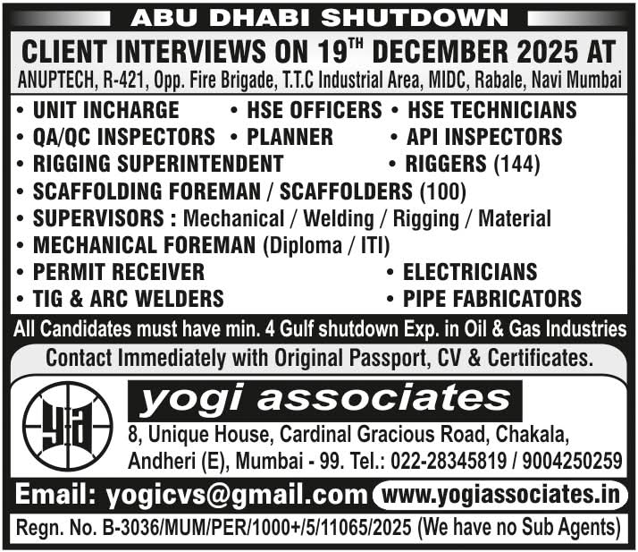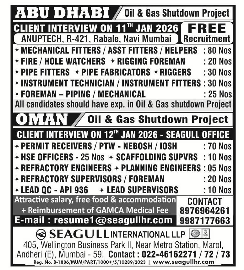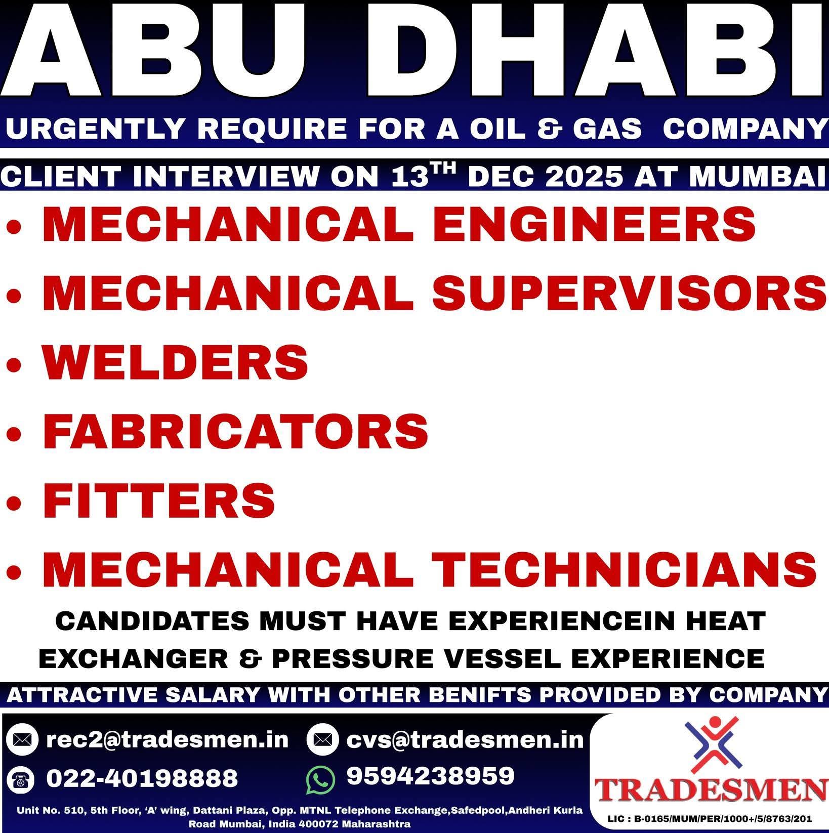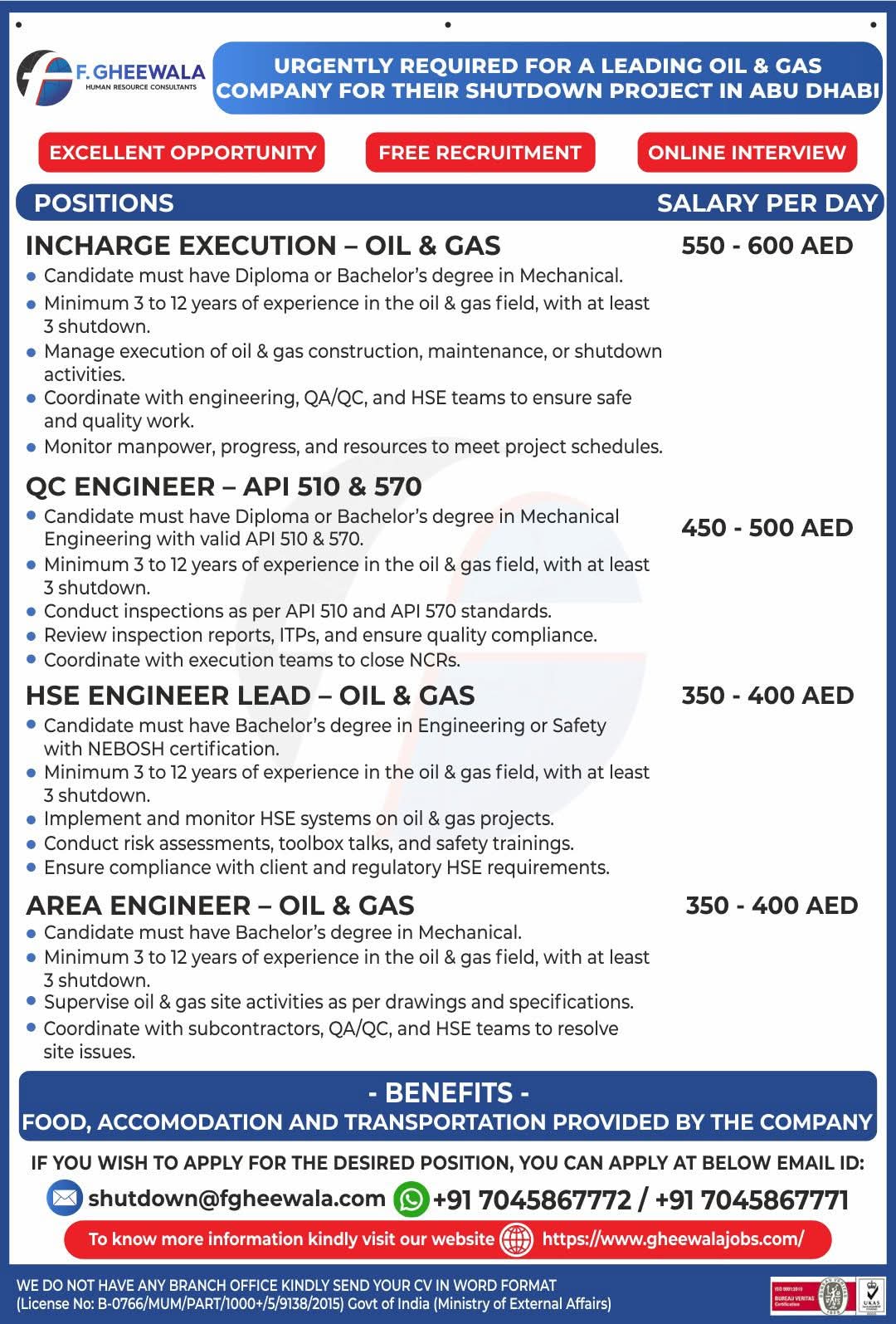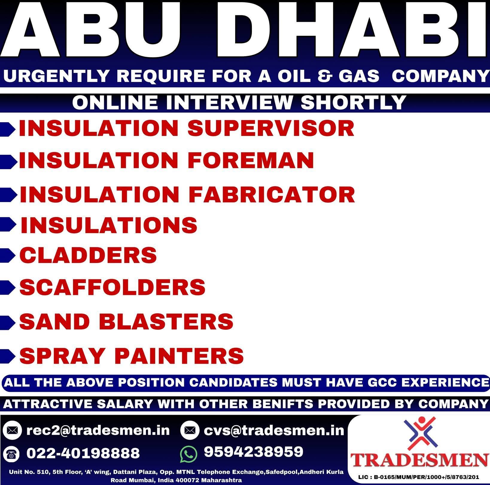 URGENTLY REQUIRED FOR A LEADING OIL & GAS COMPANY FOR THEIR SHUTDOWN PROJECT IN ABU DHABI