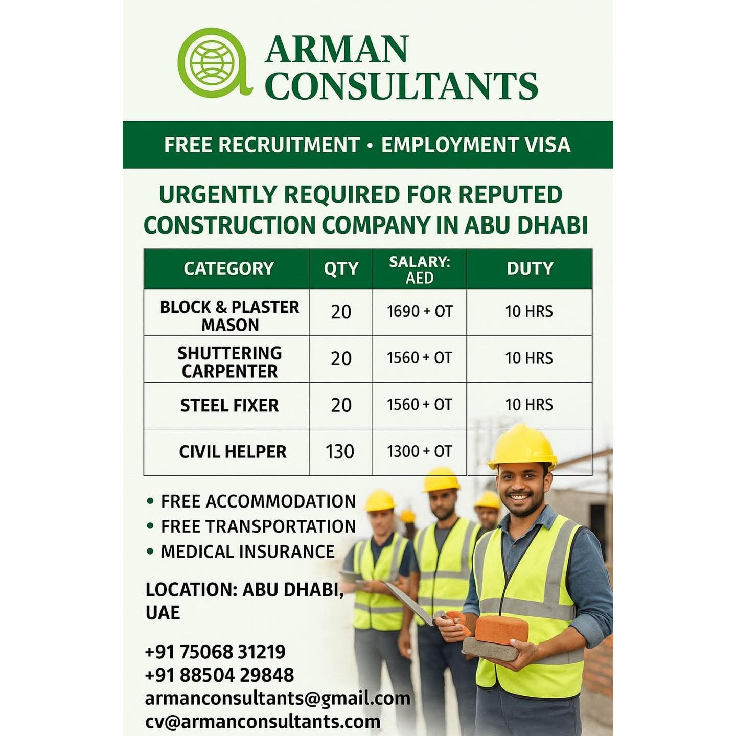 URGENTLY REQUIRED FOR REPUTED CONSTRUCTION COMPANY IN ABU DHABI