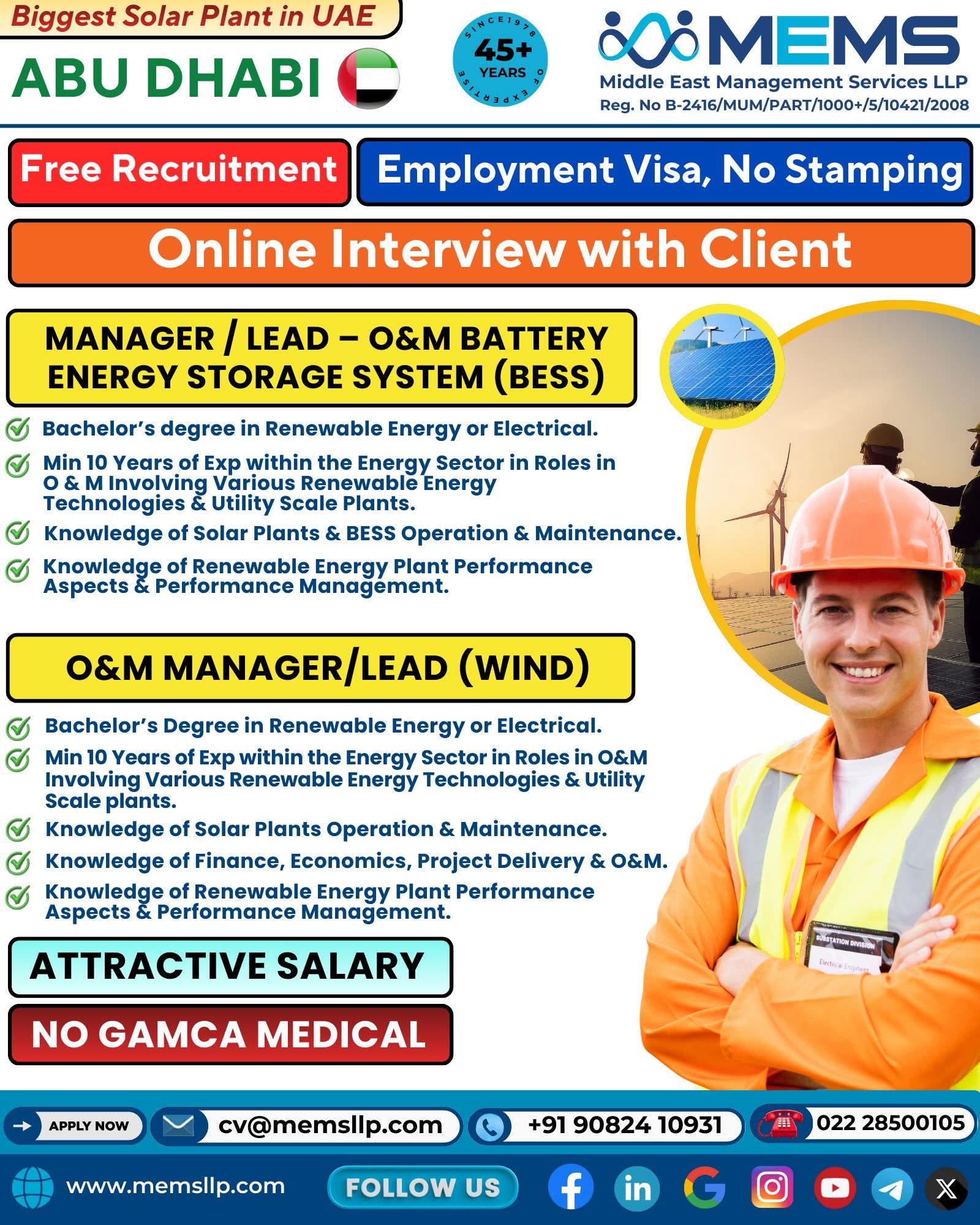 WE ARE HIRING For a Leading Italian Based EPC Company in Abu Dhabi