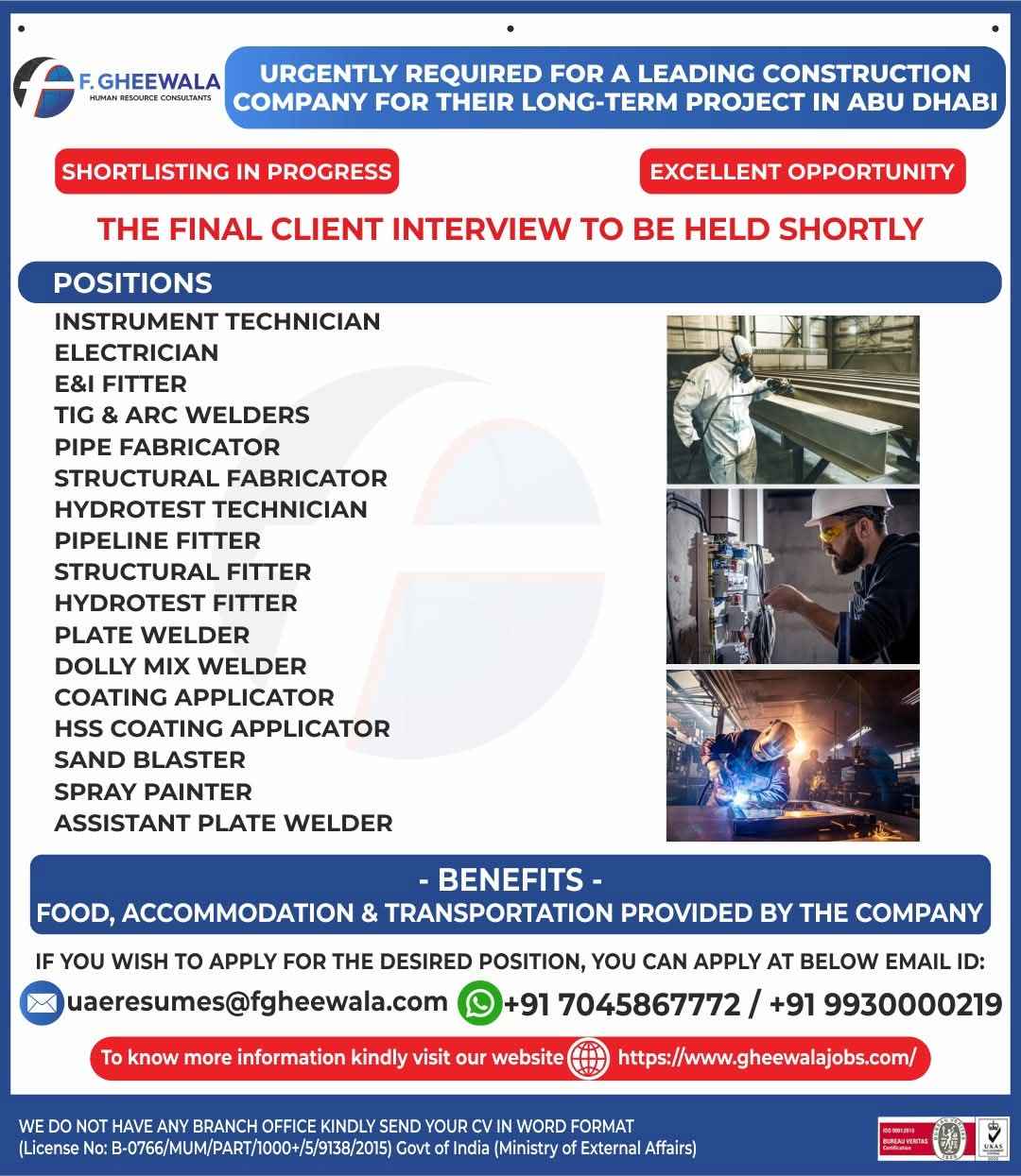 URGENTLY REQUIRED FOR A LEADING CONSTRUCTION COMPANY FOR THEIR LONG-TERM PROJECT IN ABU DHABI