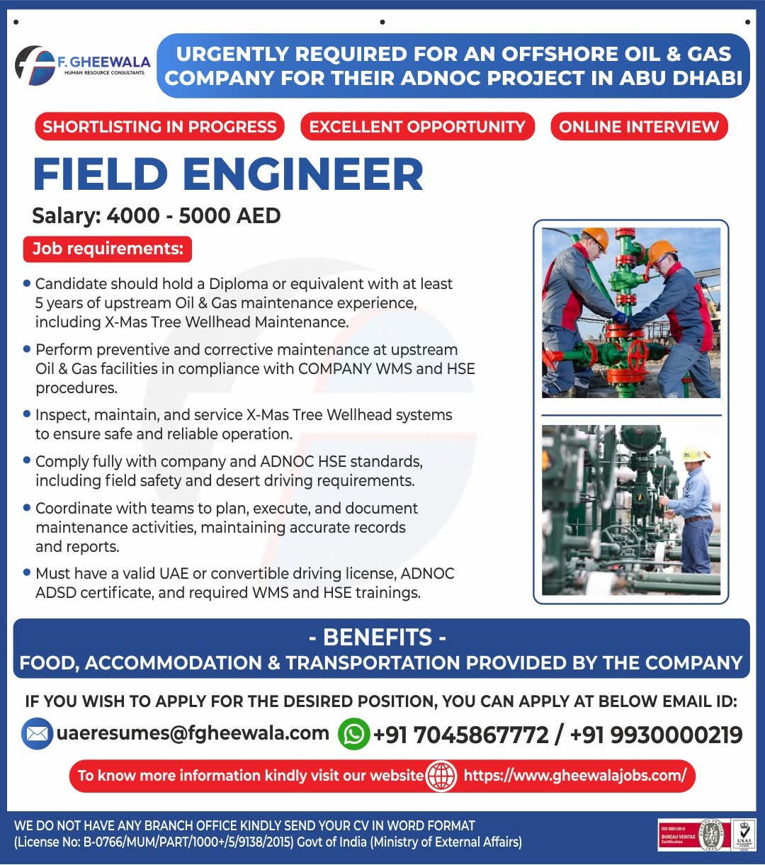 URGENTLY REQUIRED FOR AN OFFSHORE OIL & GAS COMPANY FOR THEIR ADNOC PROJECT IN ABU DHABI