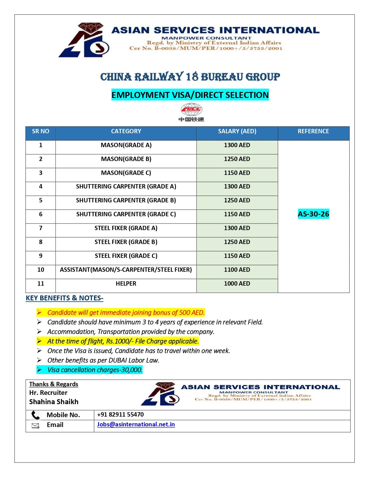 Urgent Requirement ASIAN SERVICES INTERNATIONAL