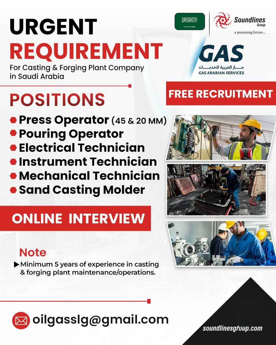 REQUIREMENT For Casting & Forging Plant Company in Saudi Arabia
