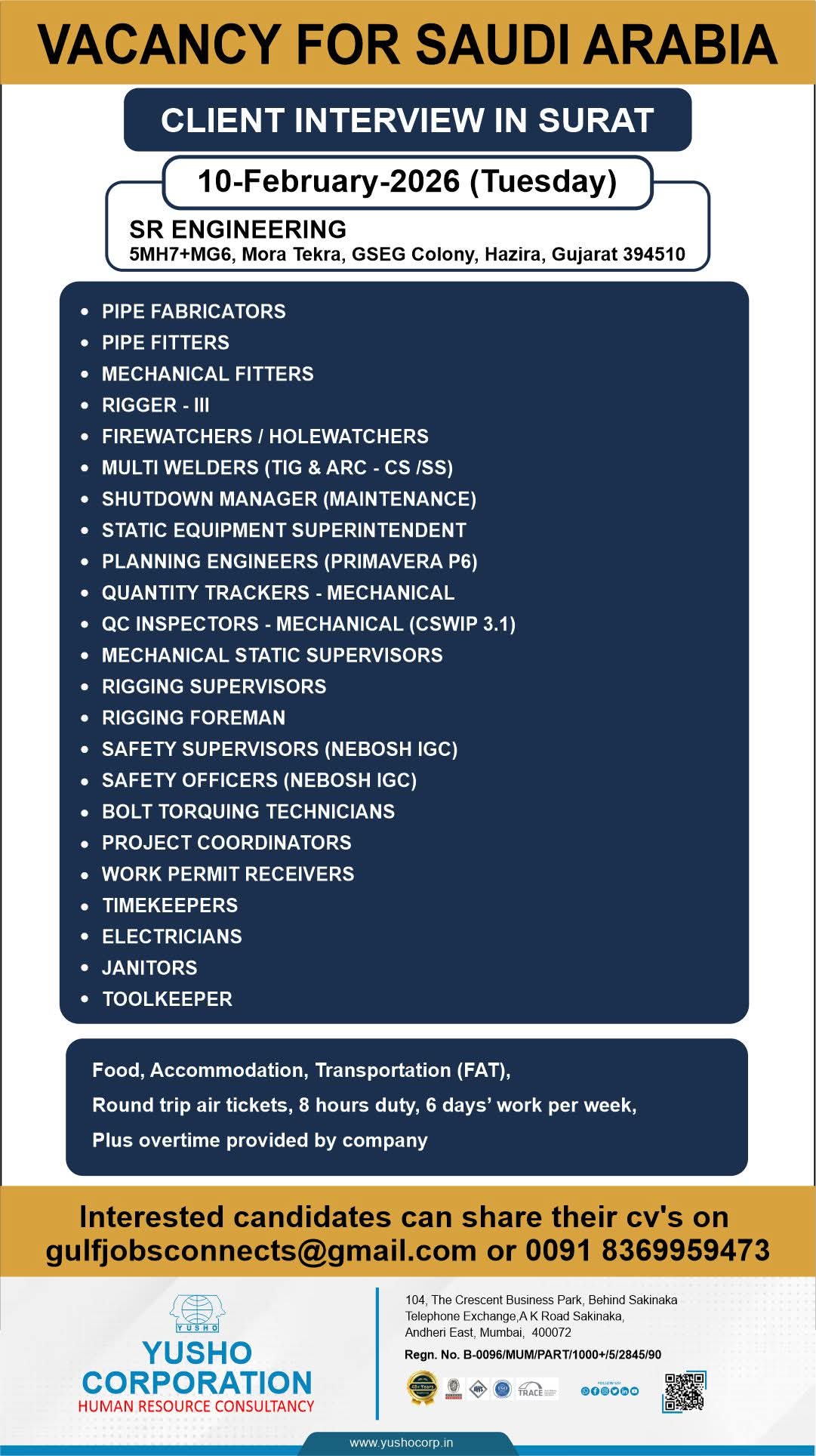 Urgent Requirement For FOR SABIC MAINTENANCE PROJECT - KSA