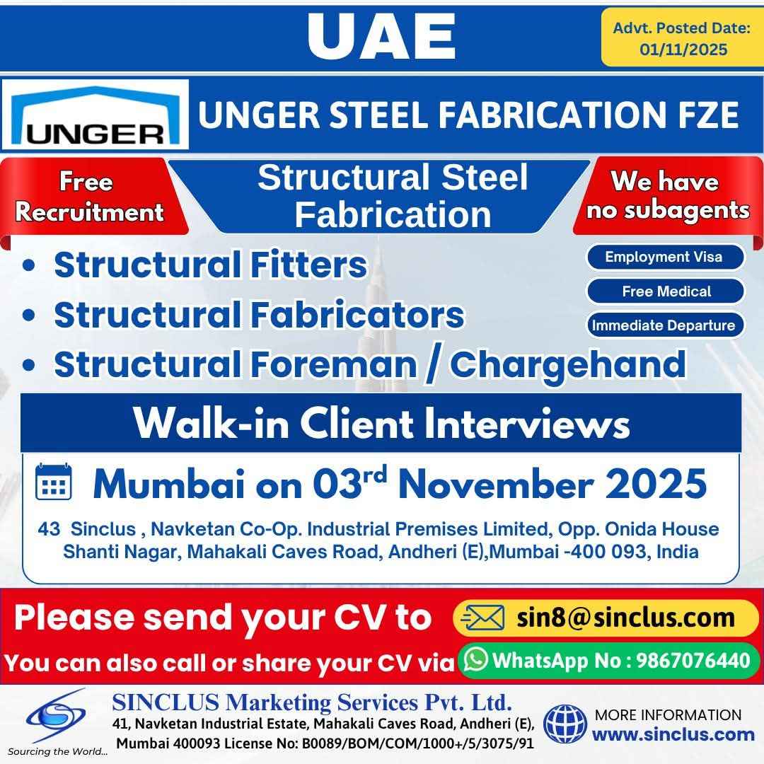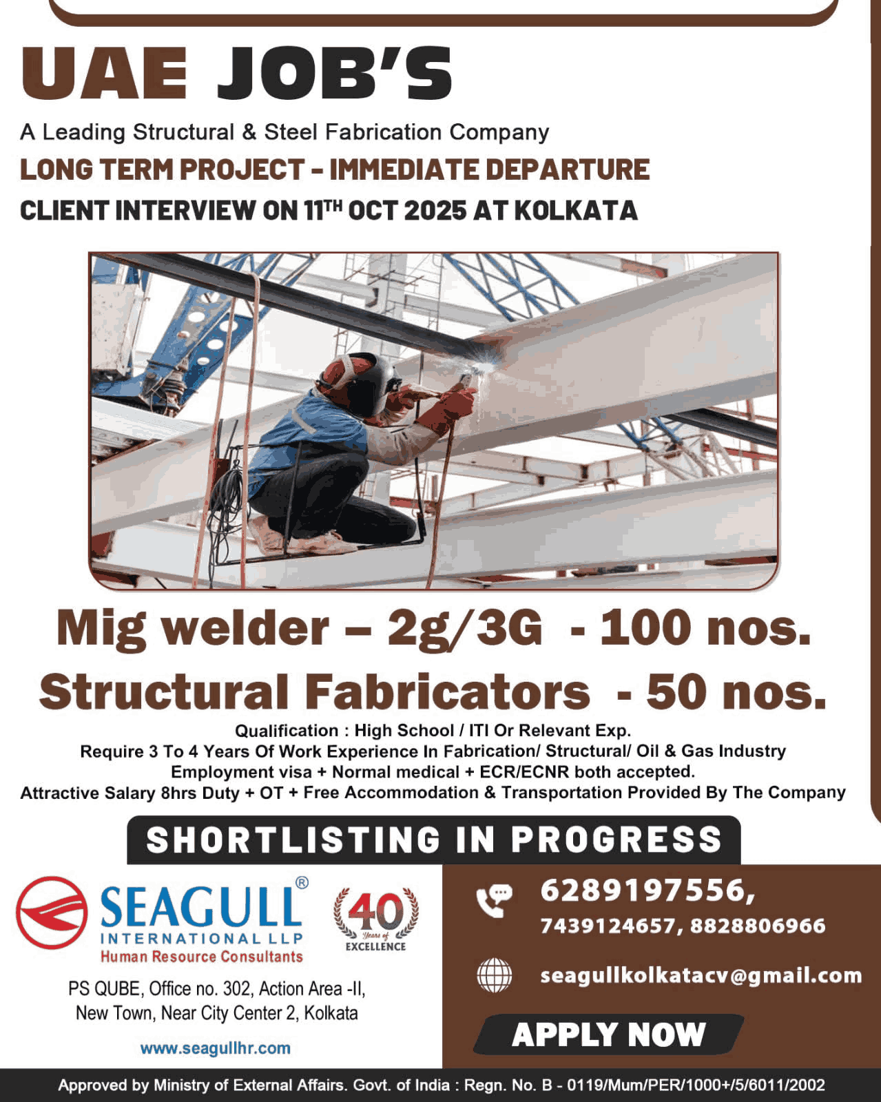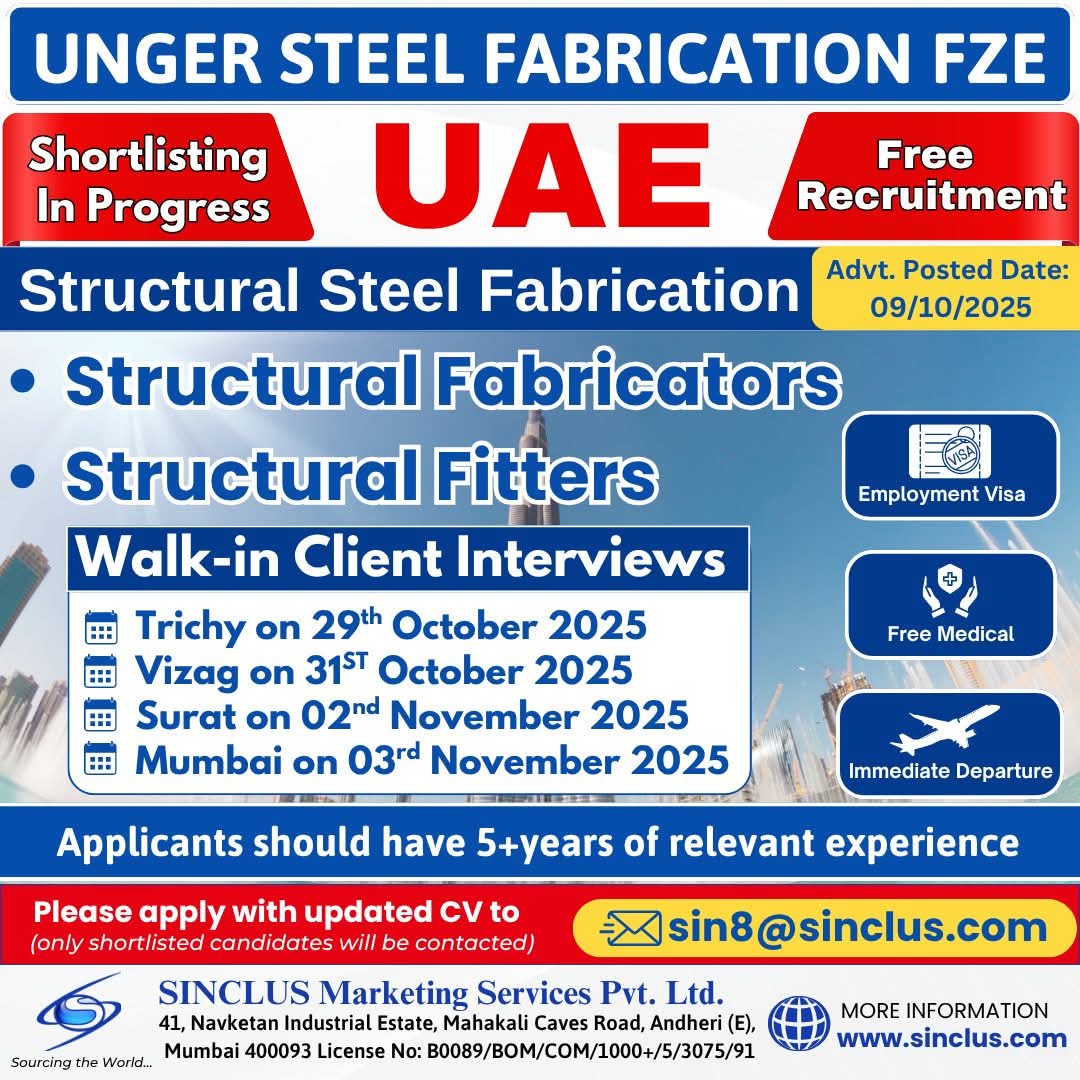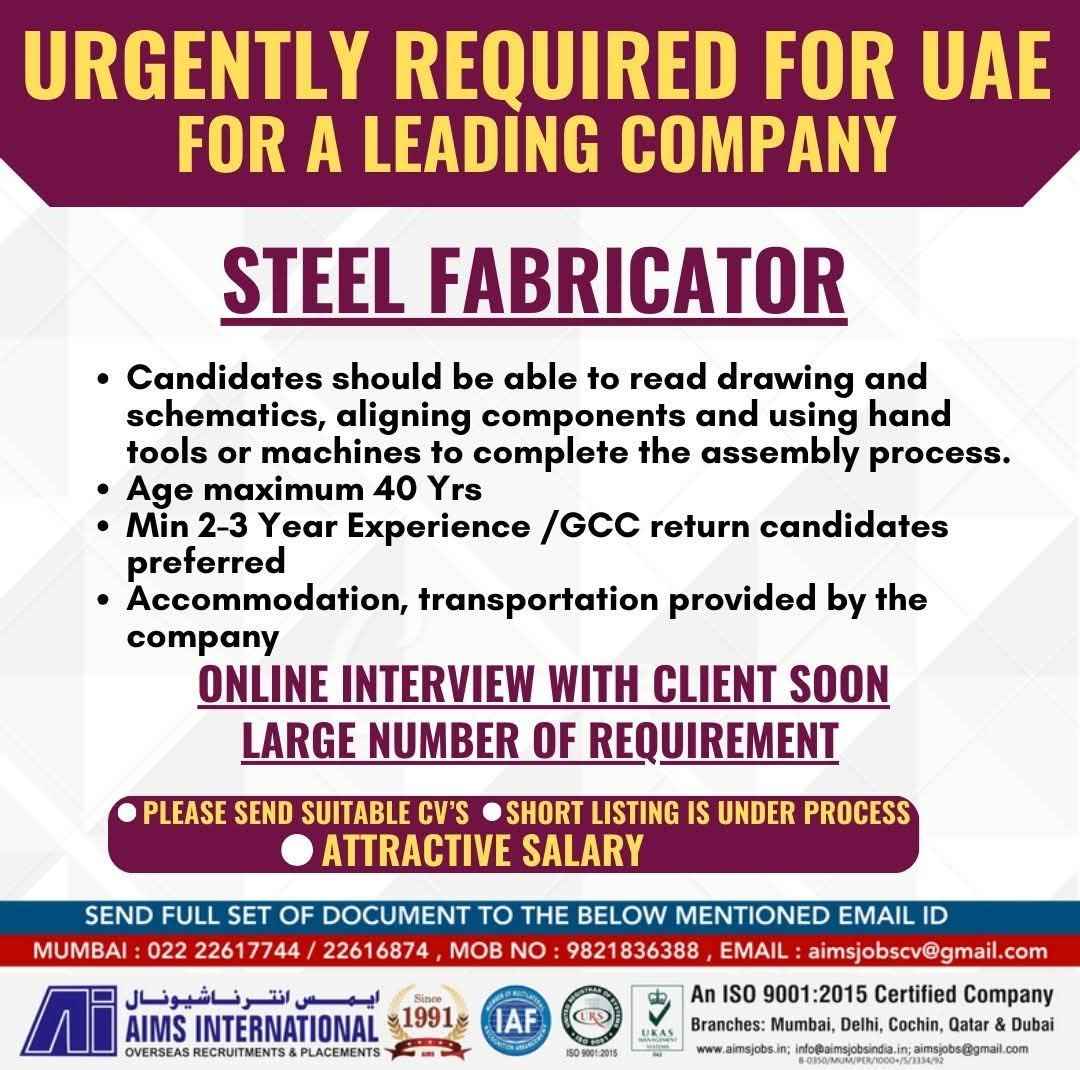 Interview 25th July JOB'S A leading steel fabrication workshop UAE