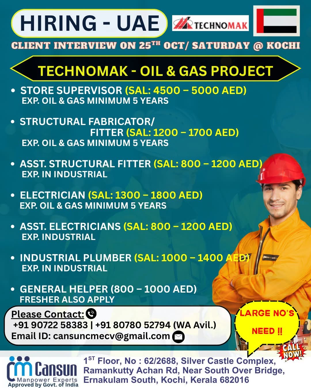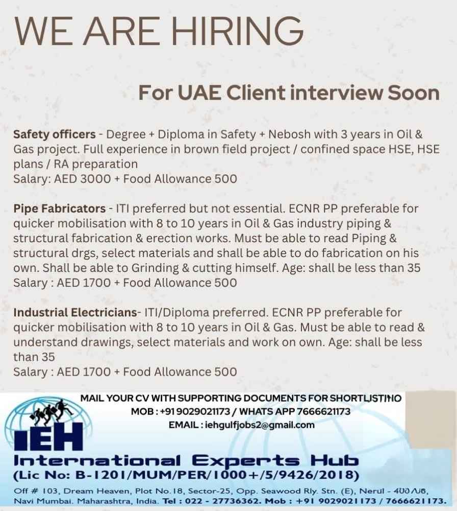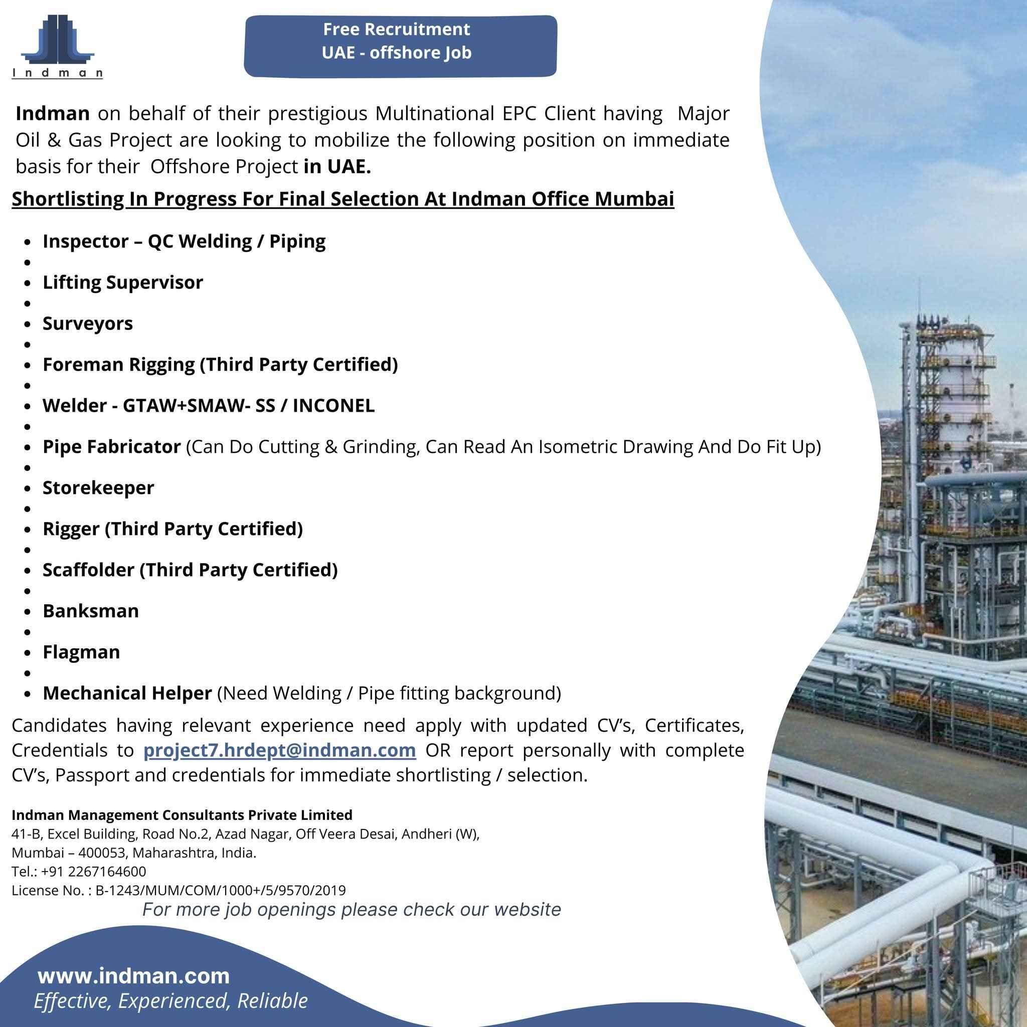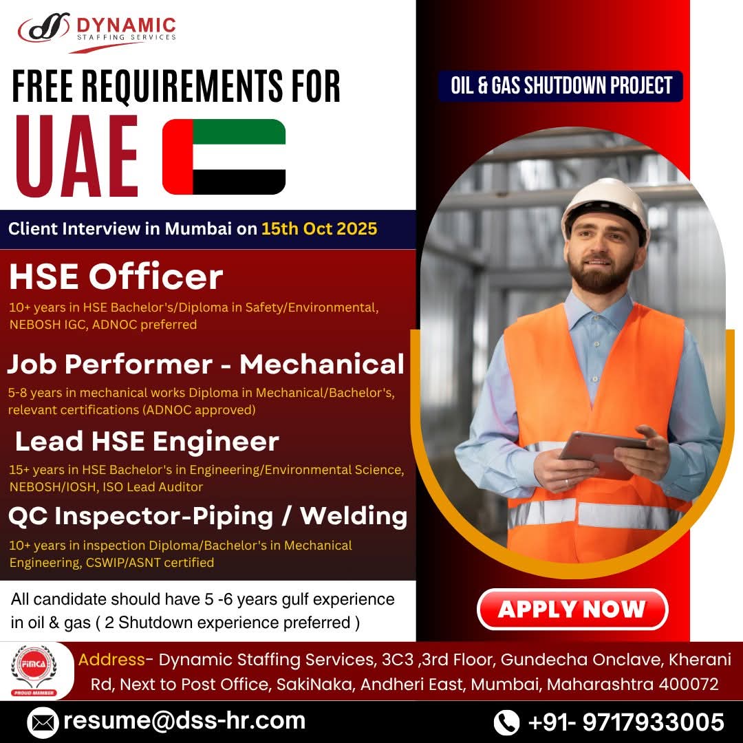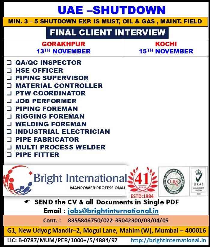 URGENTLY REQUIRED FOR A LEADING OIL & GAS COMPANY FOR THEIR SHUTDOWN PROJECT IN UAE
