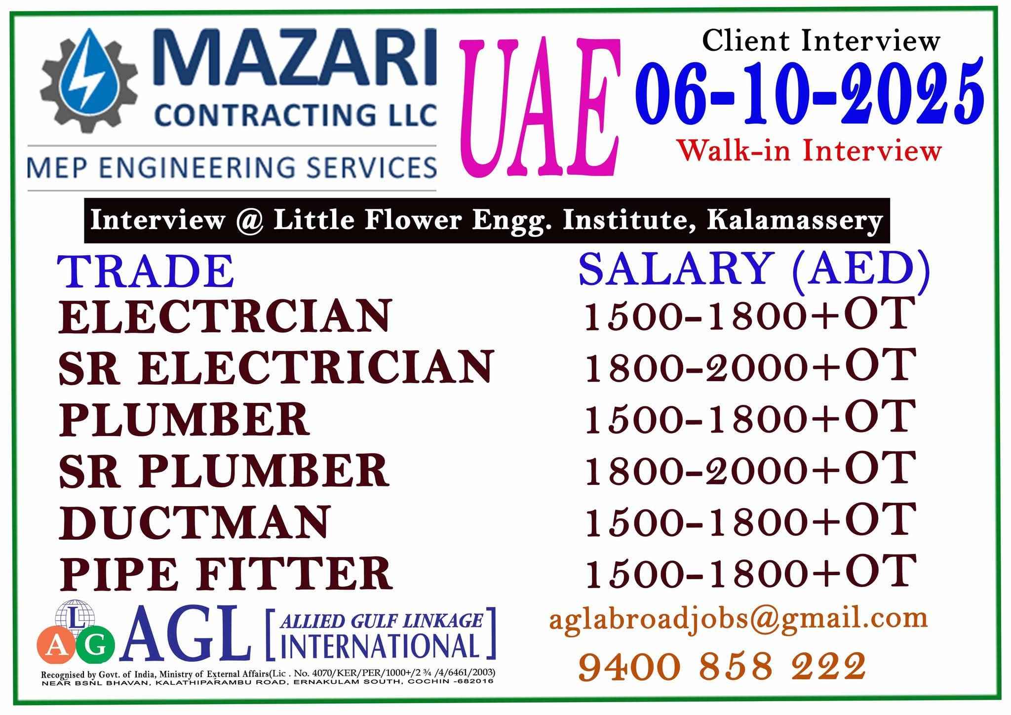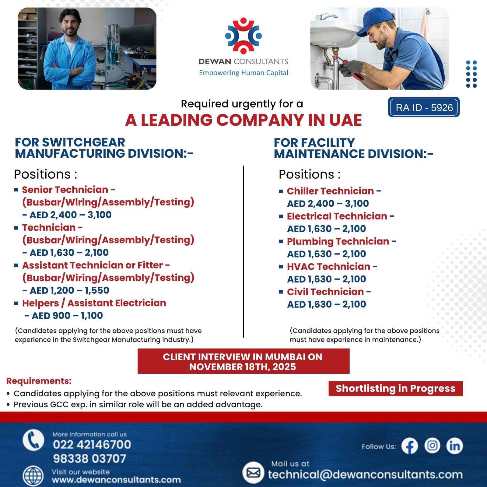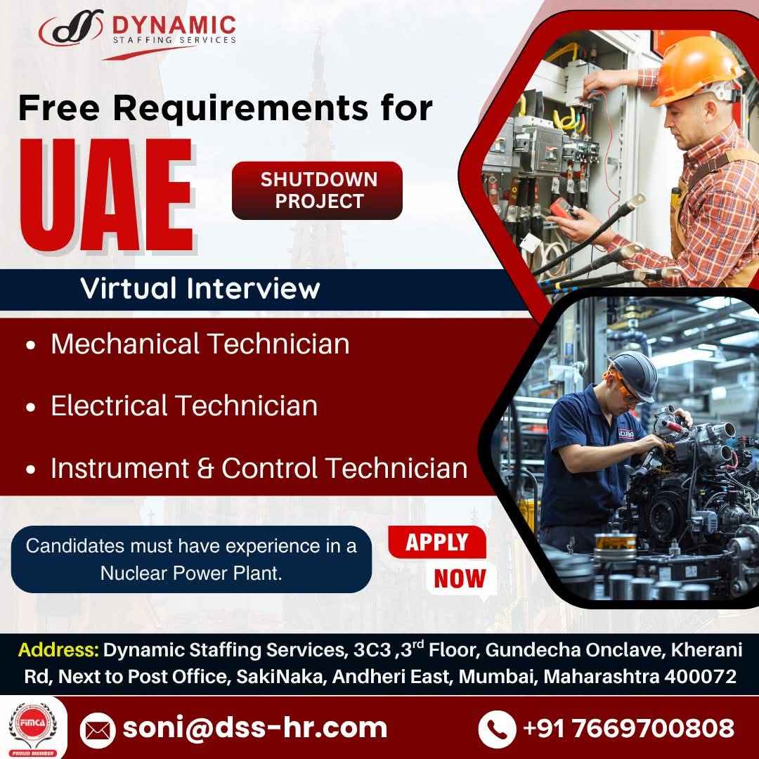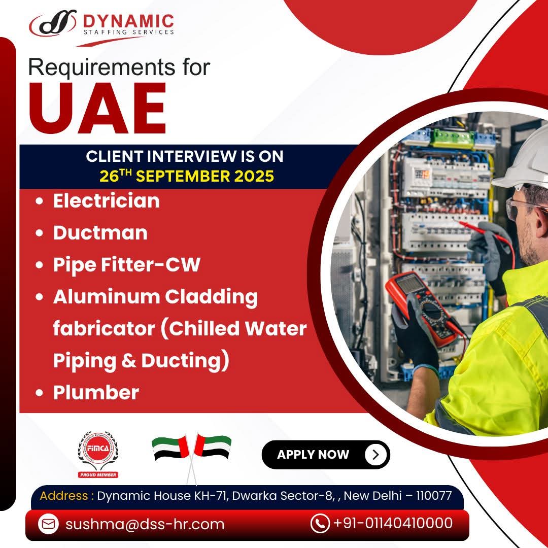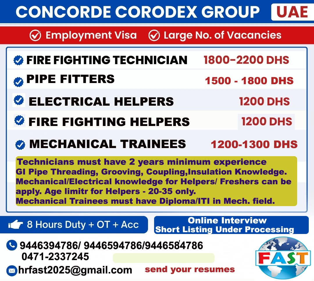 INTERVIEW ON 29TH JULY 2025 URGENT HIRING FOR TECHNICIANS UAE