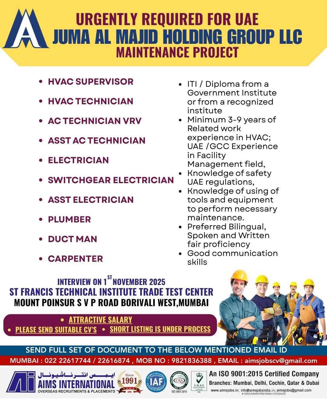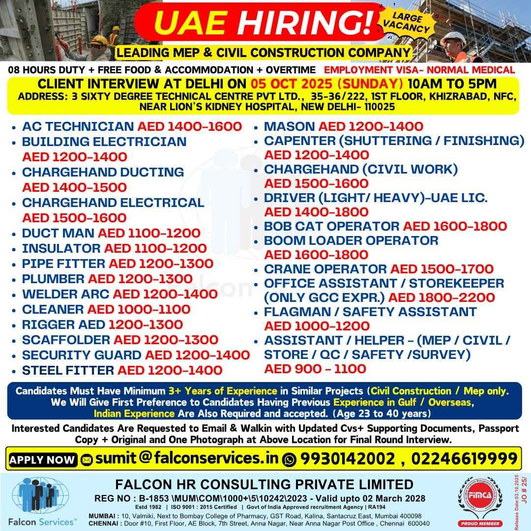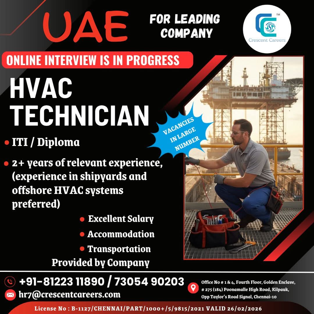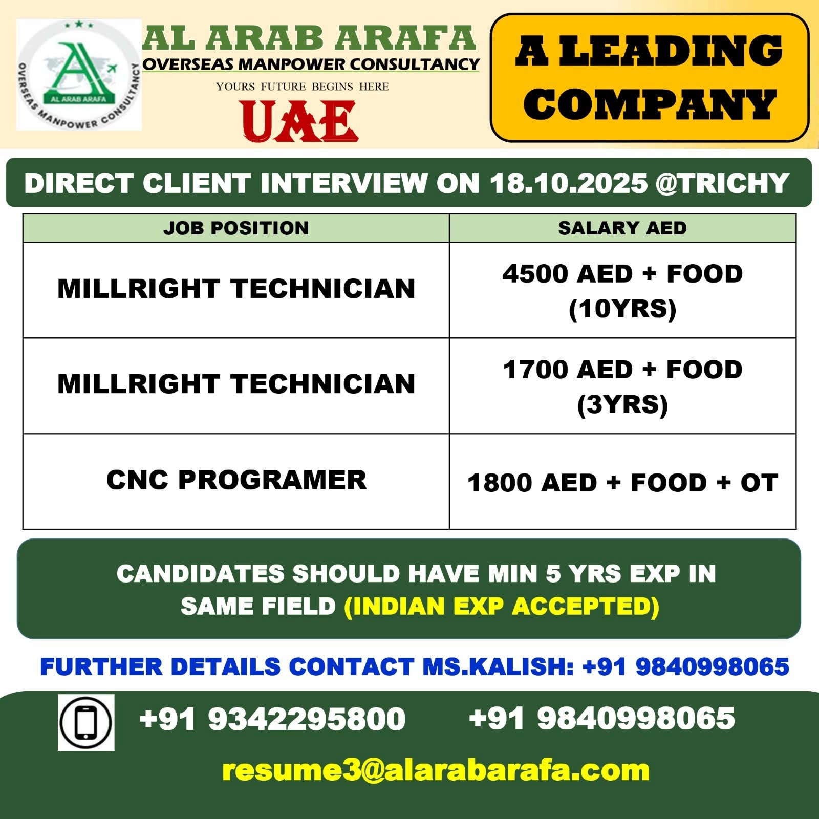 INTERVIEW ON 29TH JULY 2025 URGENT HIRING FOR TECHNICIANS UAE