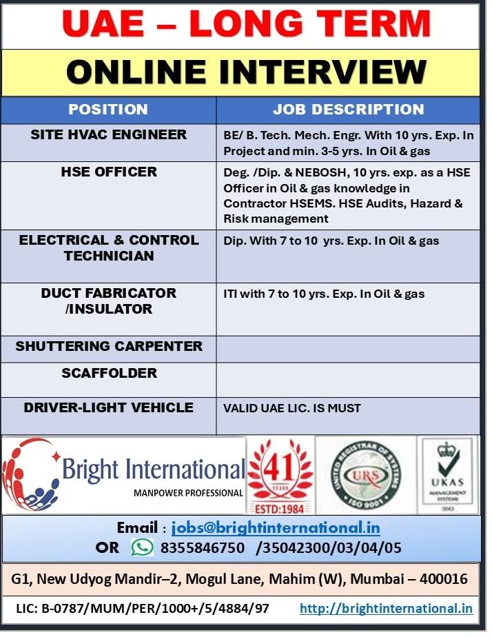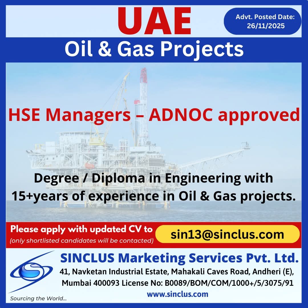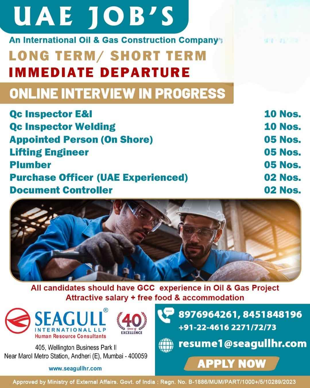 UAE JOB'S An international company requires for their ONSHORE/OFFSHORE OIL&GAS Long Term PROJECT