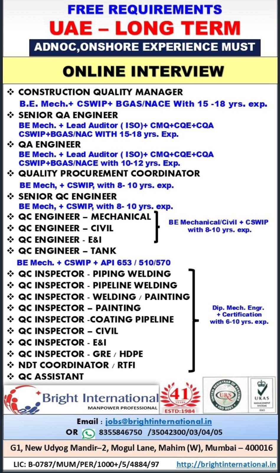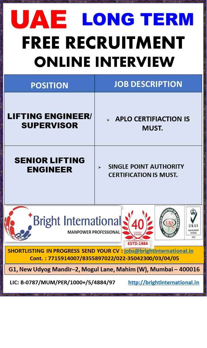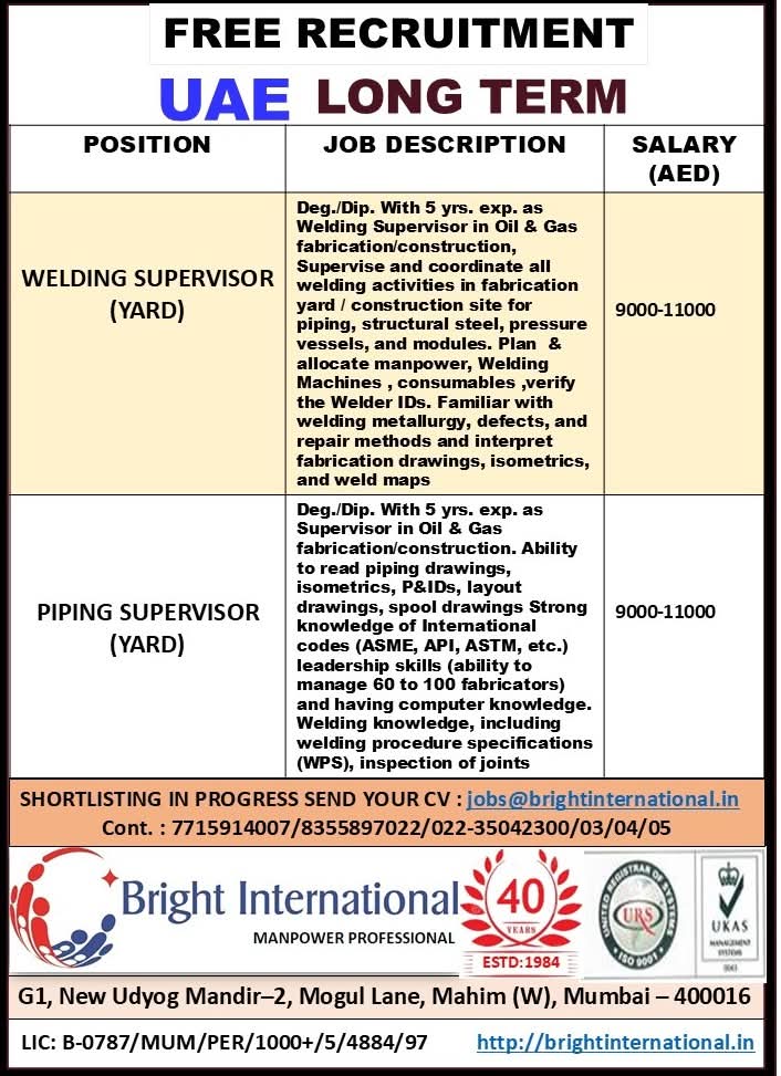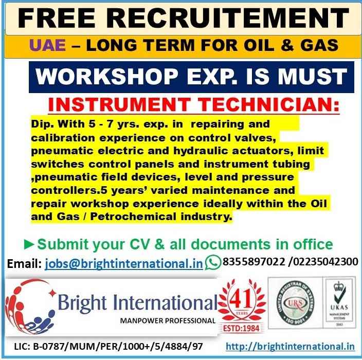 UAE JOB'S An international company requires for their ONSHORE/OFFSHORE OIL&GAS Long Term PROJECT
