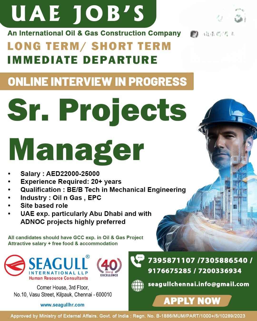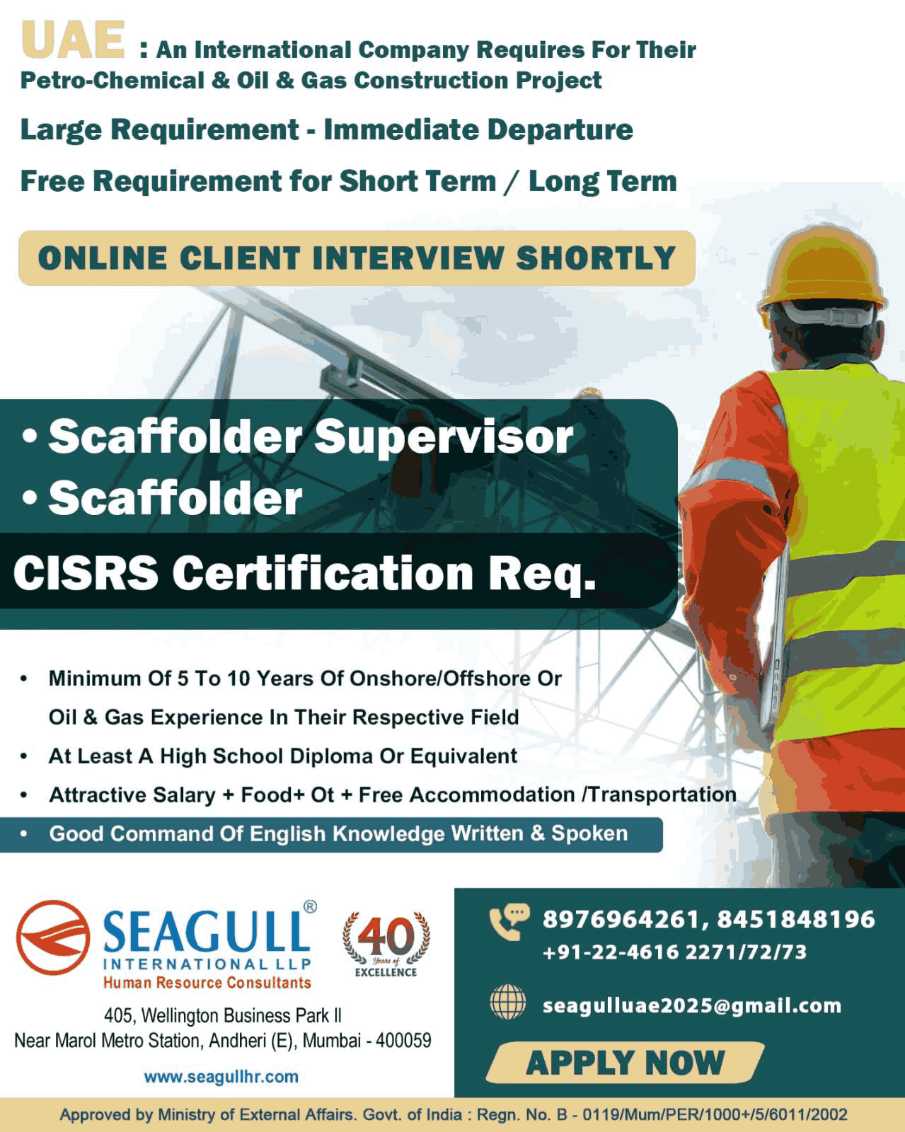 URGENTLY REQUIRED FOR A LEADING OIL & GAS COMPANY FOR THEIR ADGAS SHUTDOWN PROJECT IN UAE