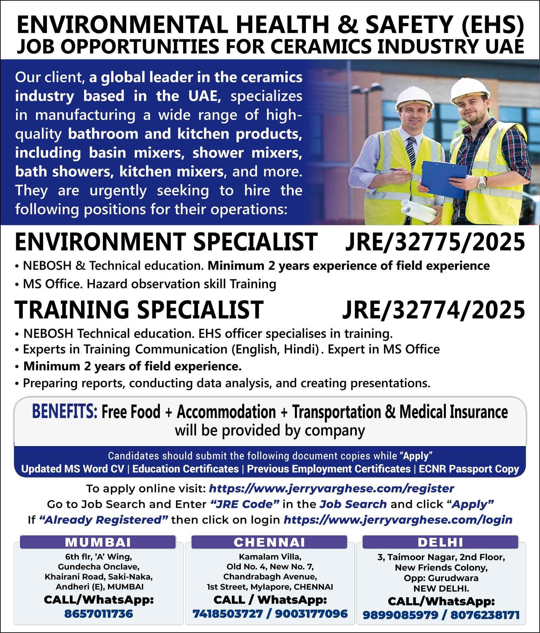 ENVIRONMENTAL HEALTH & SAFETY (EHS) JOB OPPORTUNITIES FOR CERAMICS INDUSTRY UAE