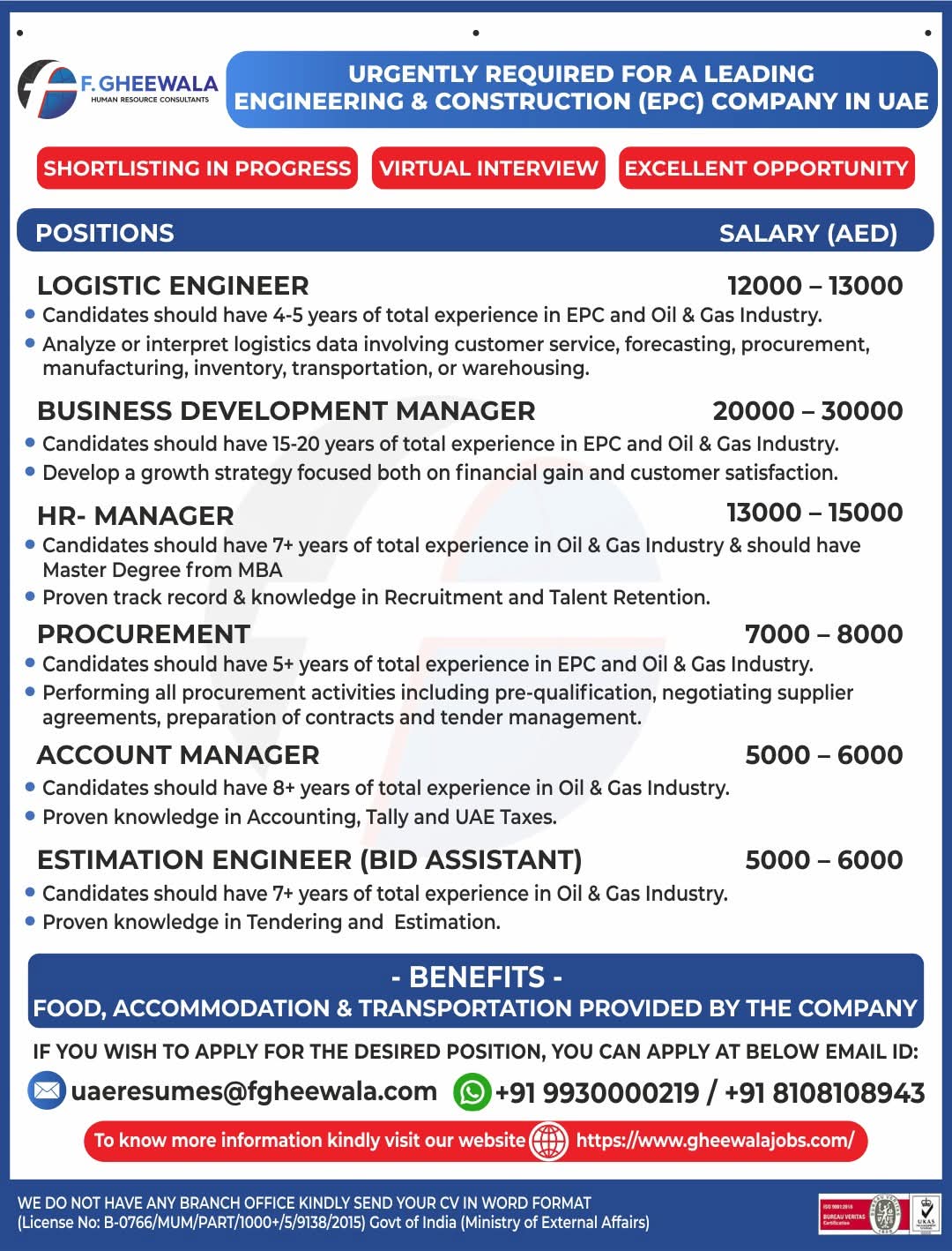 URGENTLY REQUIRED FOR A LEADING ENGINEERING & CONSTRUCTION (EPC) COMPANY IN UAE