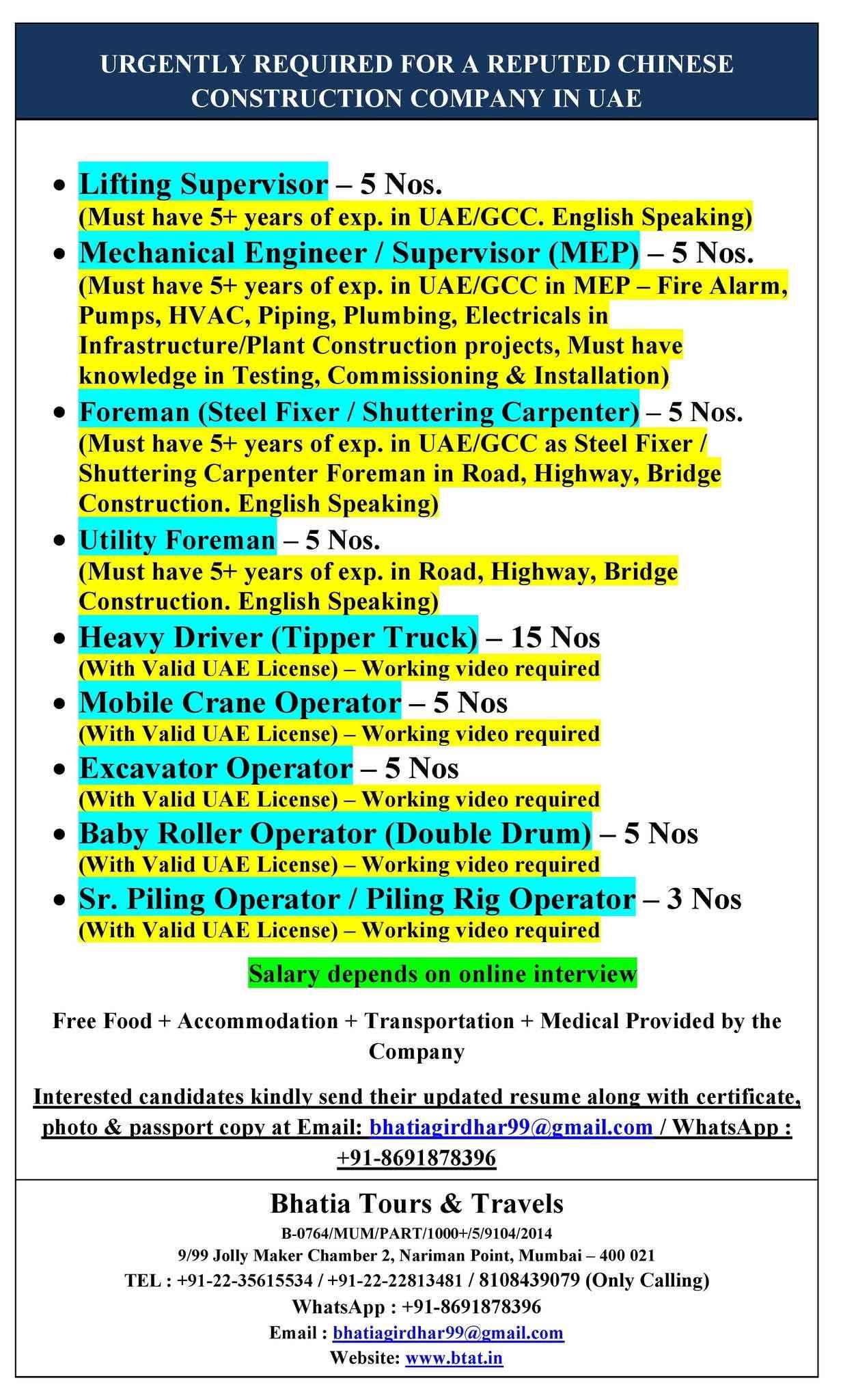URGENTLY REQUIRED FOR A REPUTED CHINESE CONSTRUCTION COMPANY IN UAE