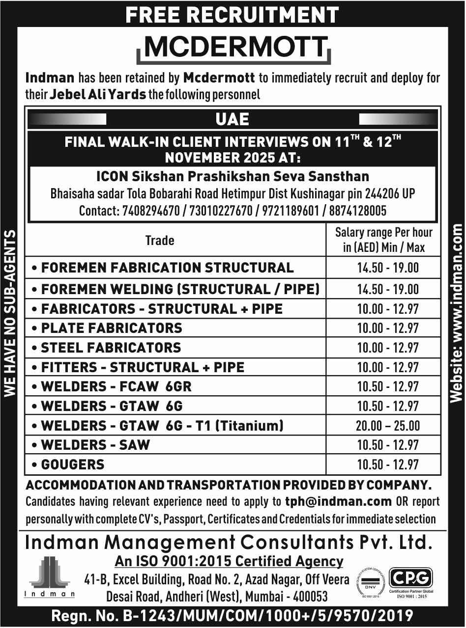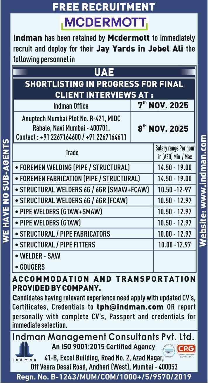 URGENT REQUIREMENT Onshore Oil and Gas Projects MCDERMOTT UAE
