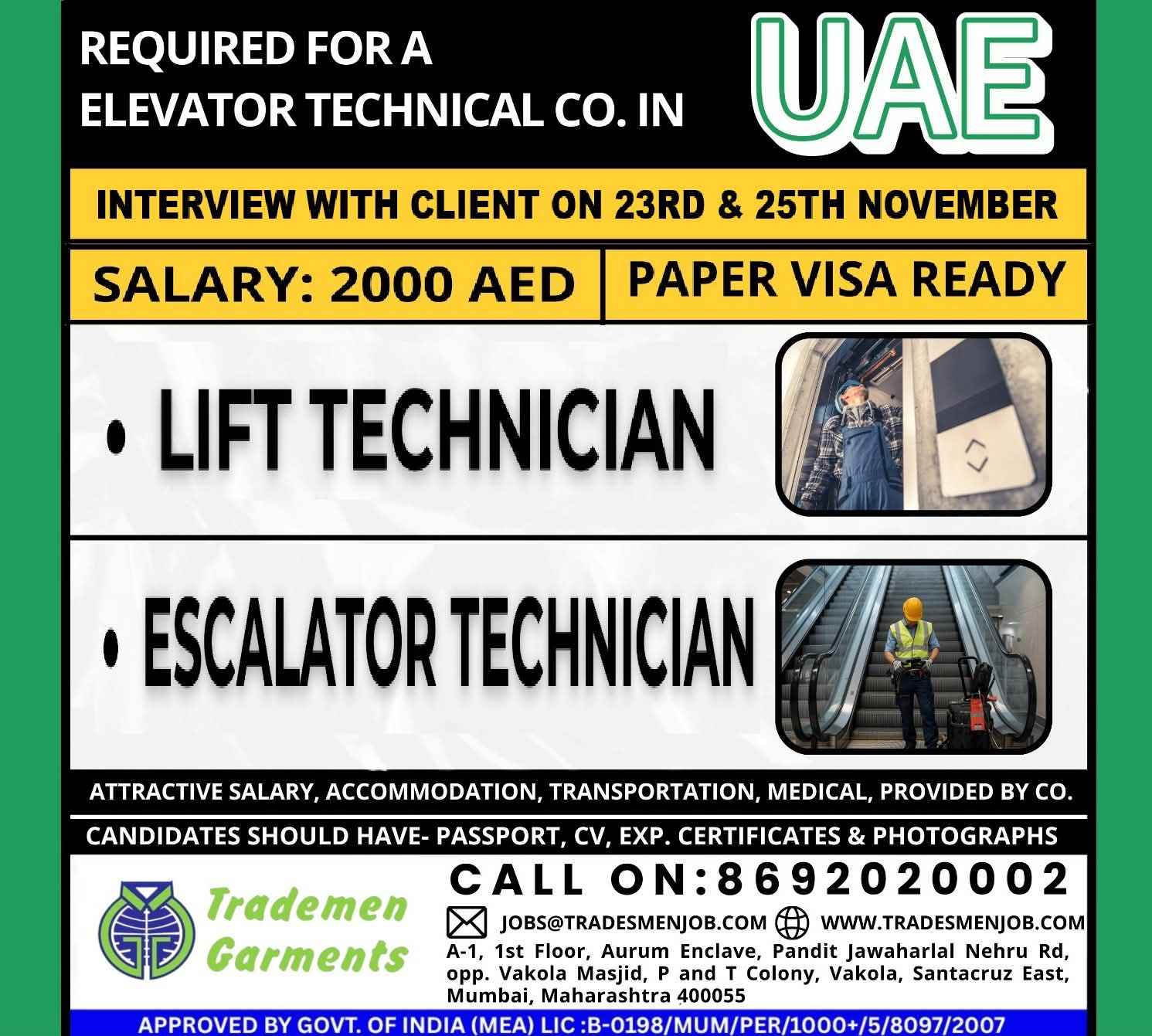 REQUIRED FOR A ELEVATOR TECHNICAL CO. IN UAE